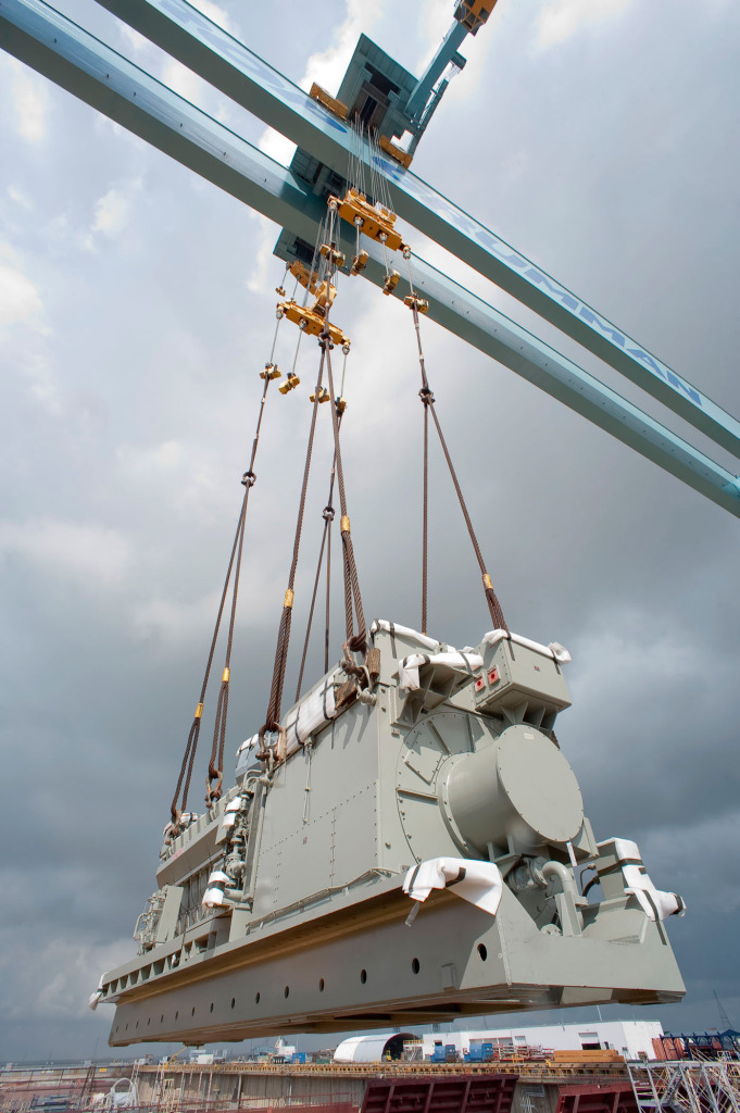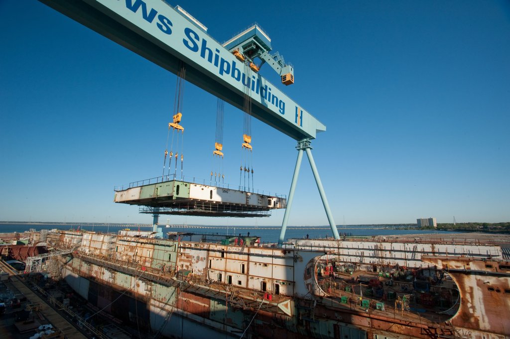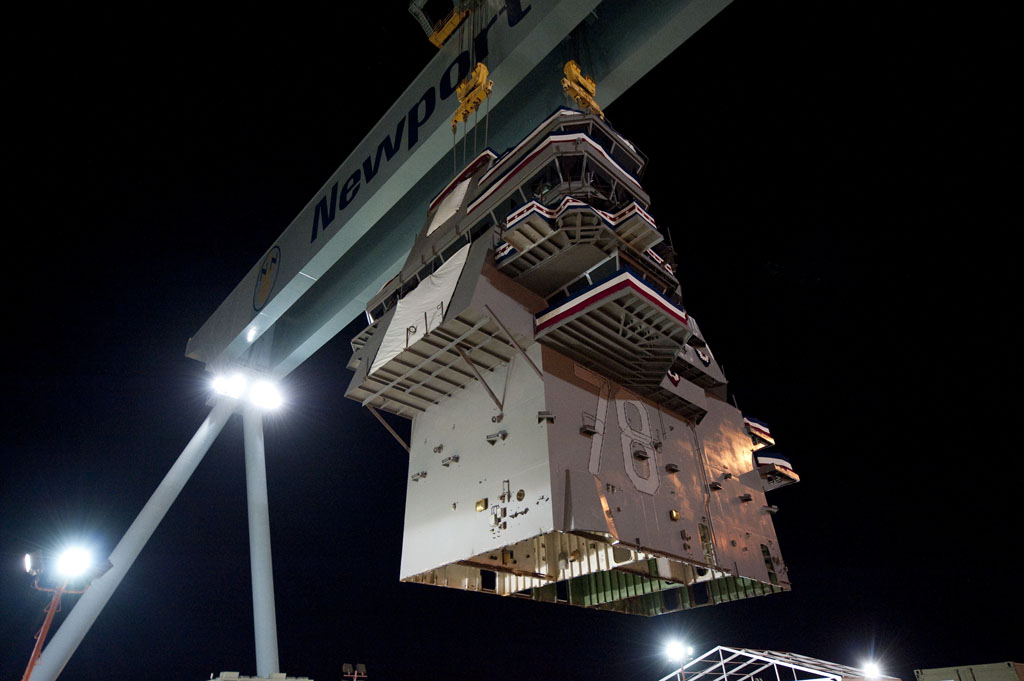 133k | An inner bottom unit of PCU Gerald R. Ford (CVN-78) is hoisted by crane at Northrop Grumman Shipbuilding, Newport News, Va., January 4, 2008. Photo by Ricky Thompson. |
