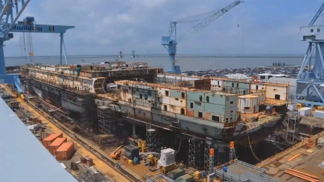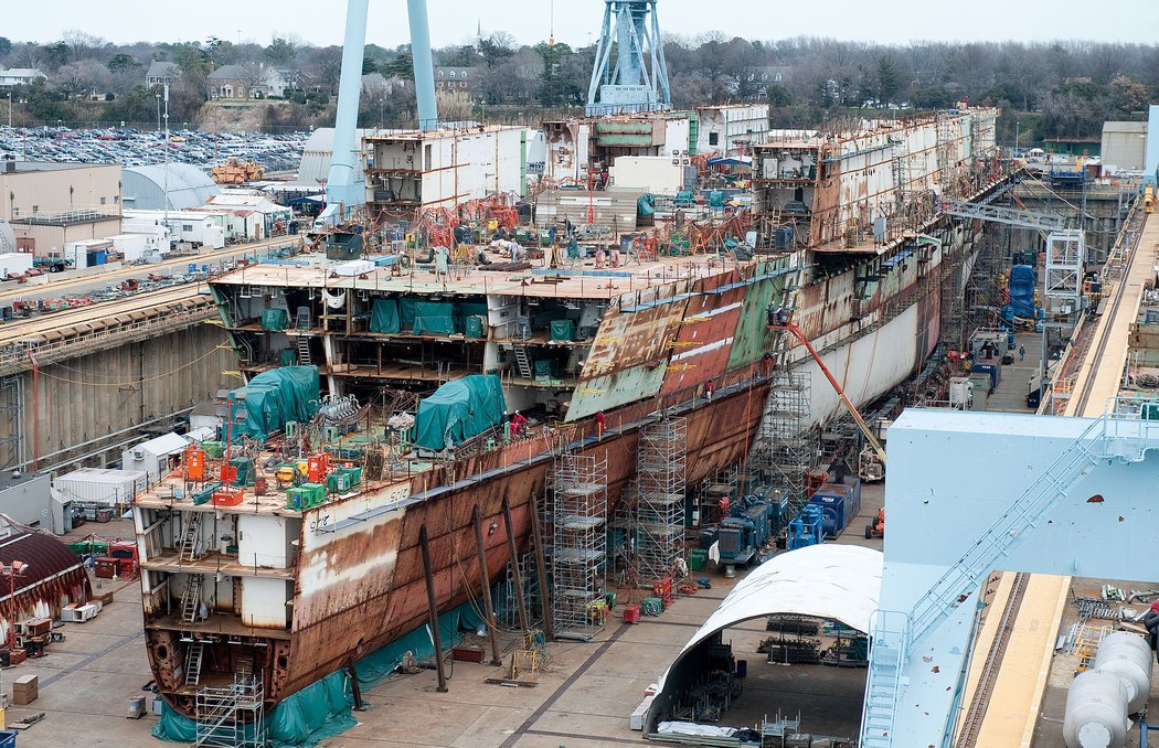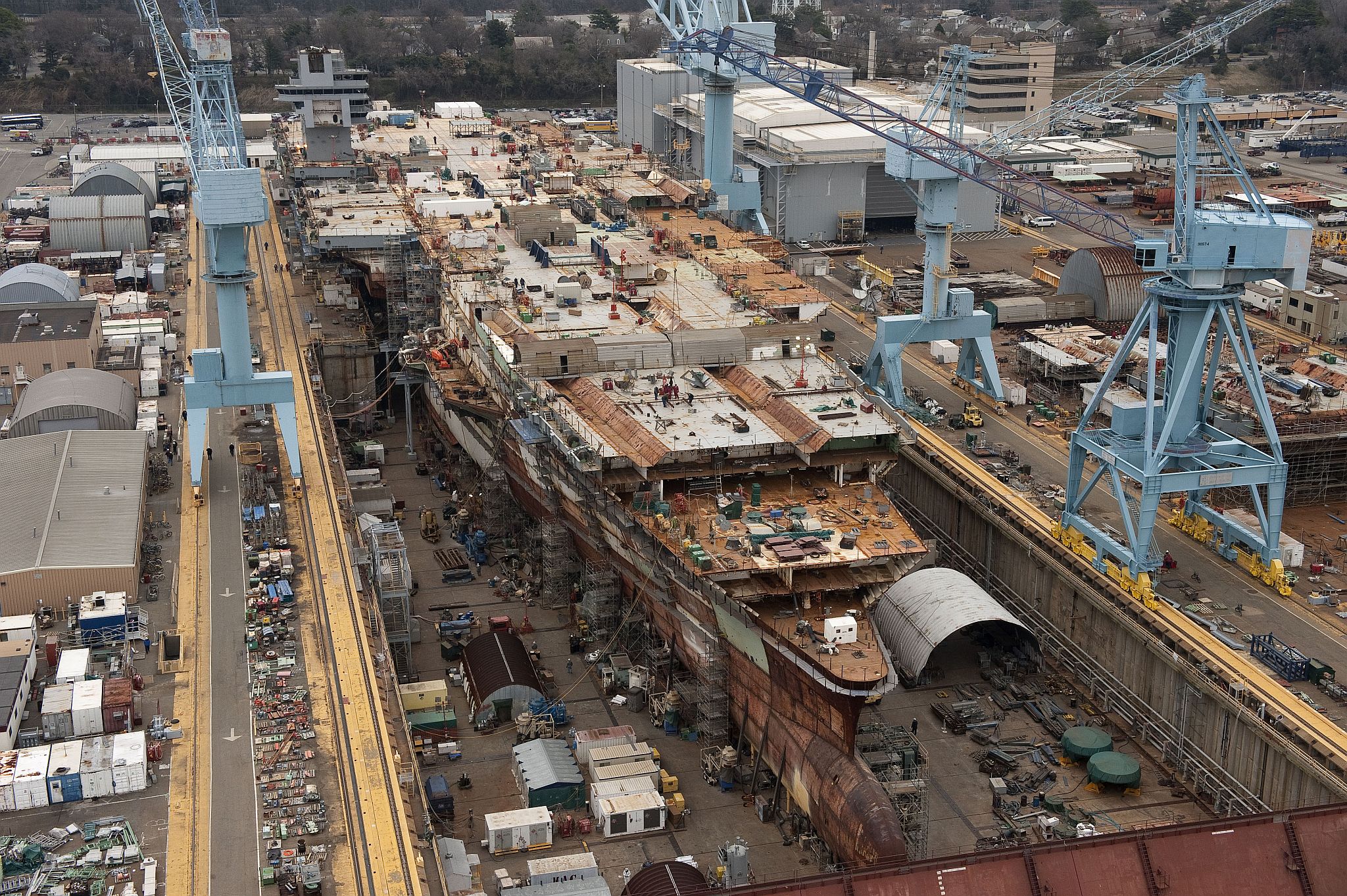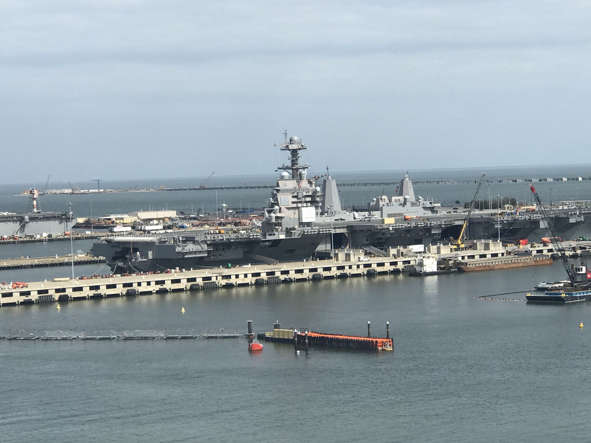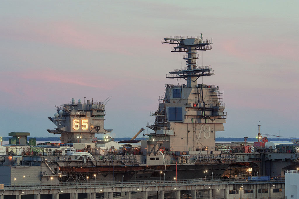 388k | Newport News Shipbuilding, 27 July 2018. Ex-USS Enterprise (CVN-65), left. USS Gerald R. Ford (CVN-78) undergoing her post-shakedown availability. Huntington-Ingalls Industries-Newport News Shipbuilding (HII-NNS) photo by Matt Hildreth. |