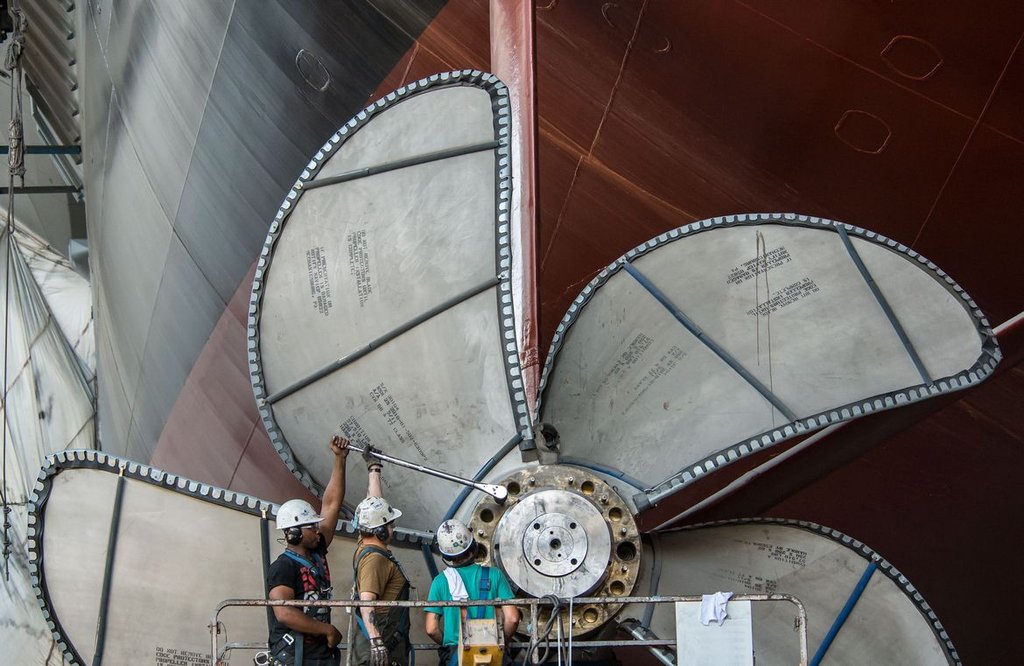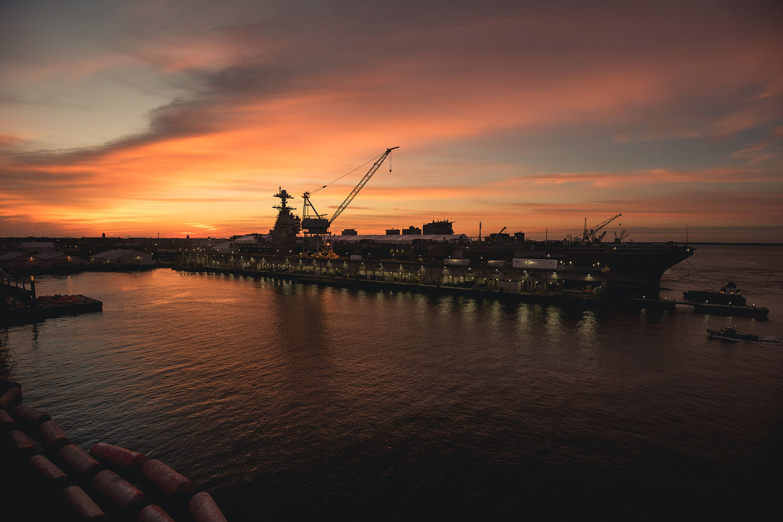 254k | USS Gerald R. Ford (CVN-78) floats pierside the morning of her turn-ship evolution, 17 March 2019. Huntington-Ingalls Industries-Newport News Shipbuilding (HII-NNS) photo by Matt Hildreth. |
