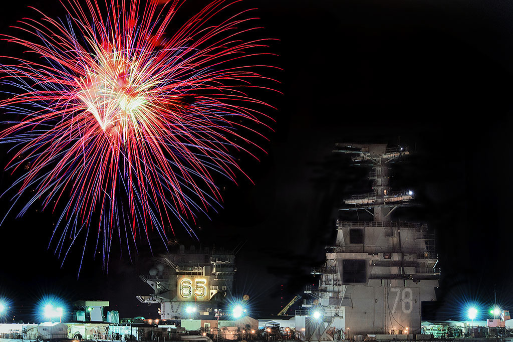 206k | The flag flies high atop a mast of USS Gerald R. Ford (CVN-78) at Newport News Shipbuilding, 4 July 2019. Huntington-Ingalls Industries-Newport News Shipbuilding (HII-NNS) photo by Matt Hildreth. |