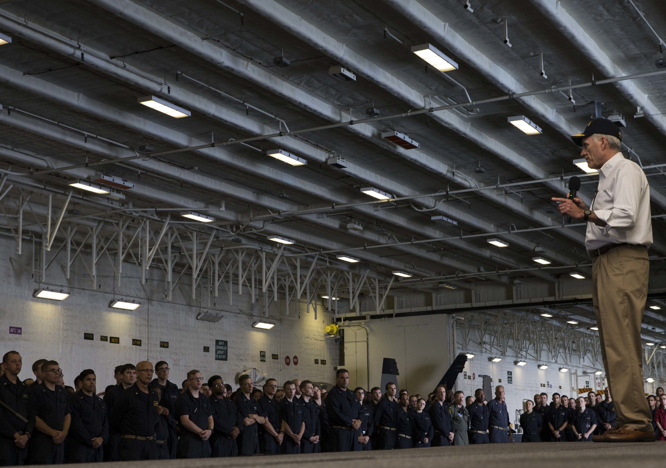 173k | VADM John Alexander, Commander, U.S. Third Fleet, delivers remarks during USS Gerald R. Ford's (CVN-78) change of command ceremony at Vista Point, Norfolk, VA, 10 August 2018. CAPT John J. "Yank" Cummings relieved CAPT Richard C. McCormack. US Navy photo # 180810-N-ZE240-0170. |