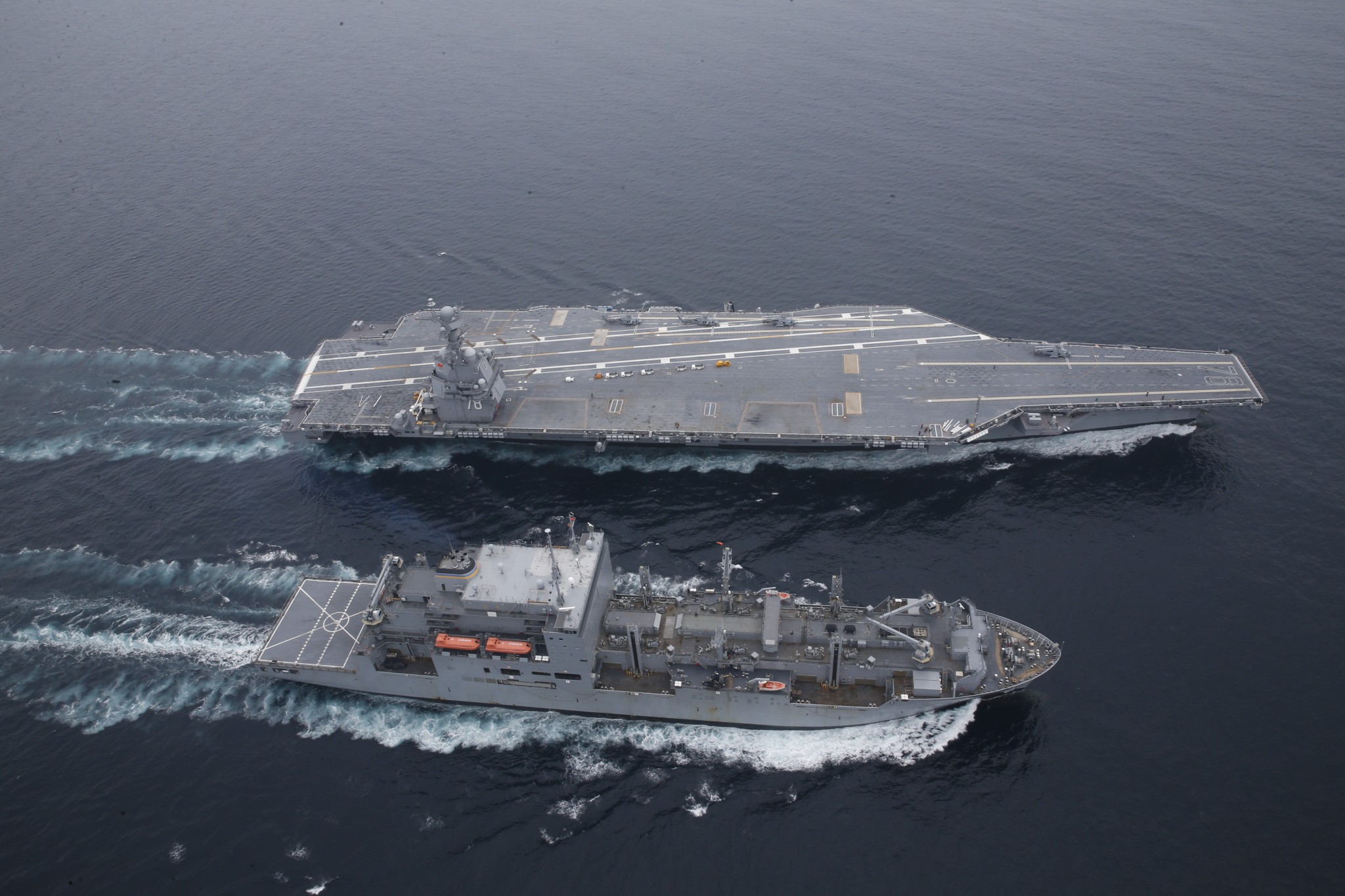 289k | USS Gerald R. Ford (CVN-78) and the Italian aircraft carrier ITS Cavour (CVH-550) [page in Italian] transit the Atlantic Ocean, 20 March 2021, marking the first time a Ford-class and Italian carrier have operated together underway. As part of the Italian Navy's Ready for Operations (RFO) campaign for its flagship, Cavour was conducting sea trials in coordination with the F-35 Lightning II Joint Program Office's Patuxent River Integrated Test Force to obtain official certification to safely operate the F-35B. Gerald R. Ford was conducting integrated carrier strike group operations during independent steaming event 17 as part of her post-delivery test and trials phase of operations. U. S. Navy photo by Mass Communication Specialist 3rd Class Riley McDowell (# 210320-N-OH637-1157). |