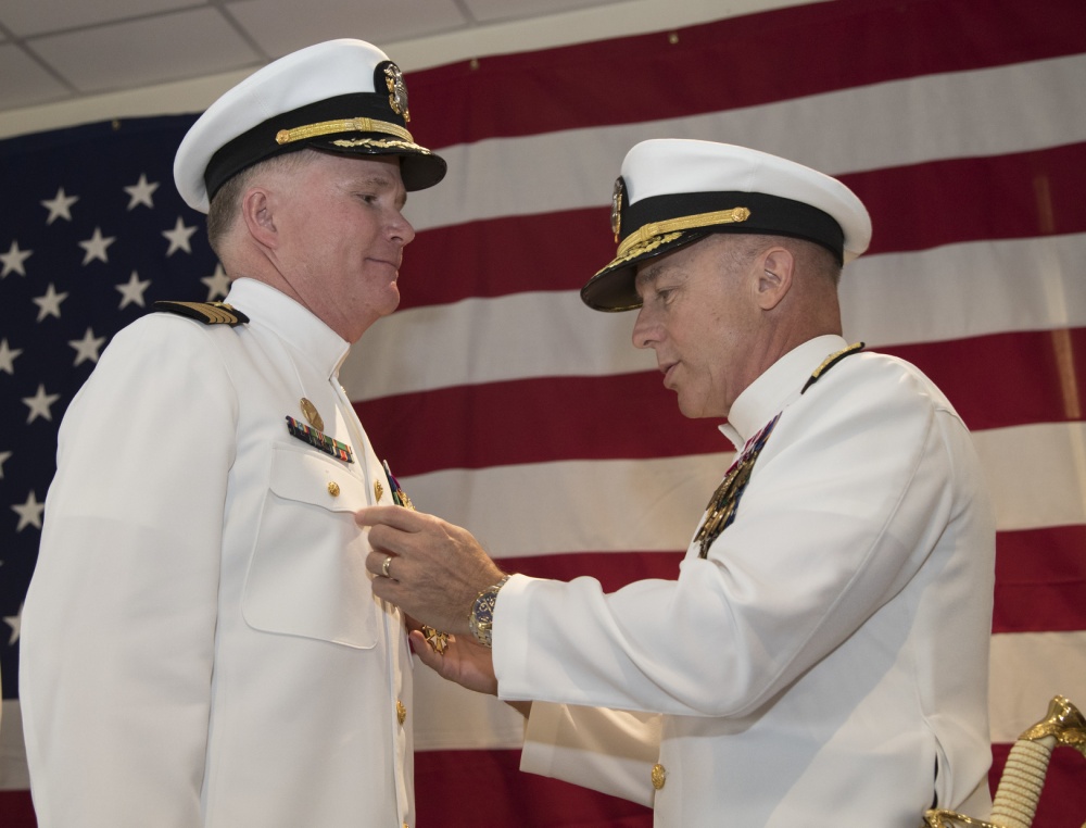 167k | CAPT Richard McCormack, USS Gerald R. Ford's (CVN-78) commanding officer, receives the Legion of Merit award from RADM Roy J. Kelley, Commander, Naval Air Force, Atlantic, during the ship's change of command ceremony at Vista Point, Norfolk, VA, 10 August 2018. The change of command ceremony is a time-honored Naval tradition in which the transfer of responsibility, authority, and accountability occurs from one individual to another individual. US Navy photo # 180810-N-ZE240-0054. |