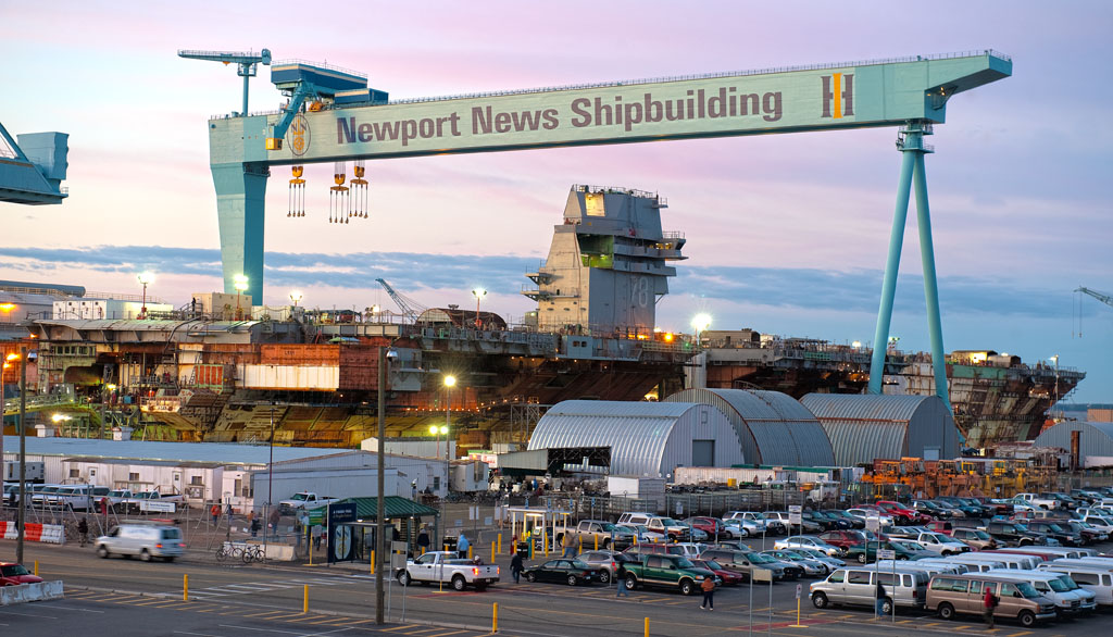 278k | Carriers and subs are lined up along the South yard's piers, 13 November 2018. Huntington Ingalls Industries, Newport News Shipbuilding (HII-NNS) photo by Matt Hildreth, # DCS18-765-30. |