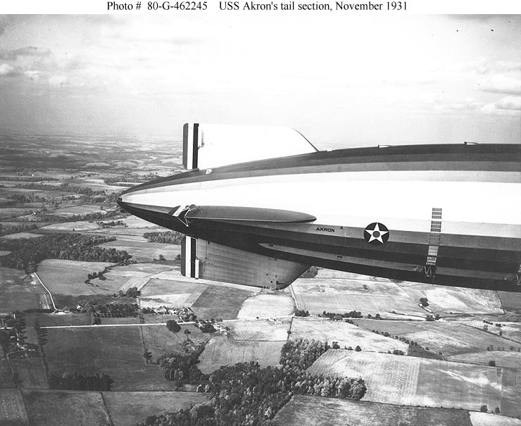 87k | View of the airship's tail section, while USS Akron (ZRS-4) was in flight on 2 November 1931. Official U.S. Navy Photograph, now in the collections of the National Archives (# 80-G-462245). |
