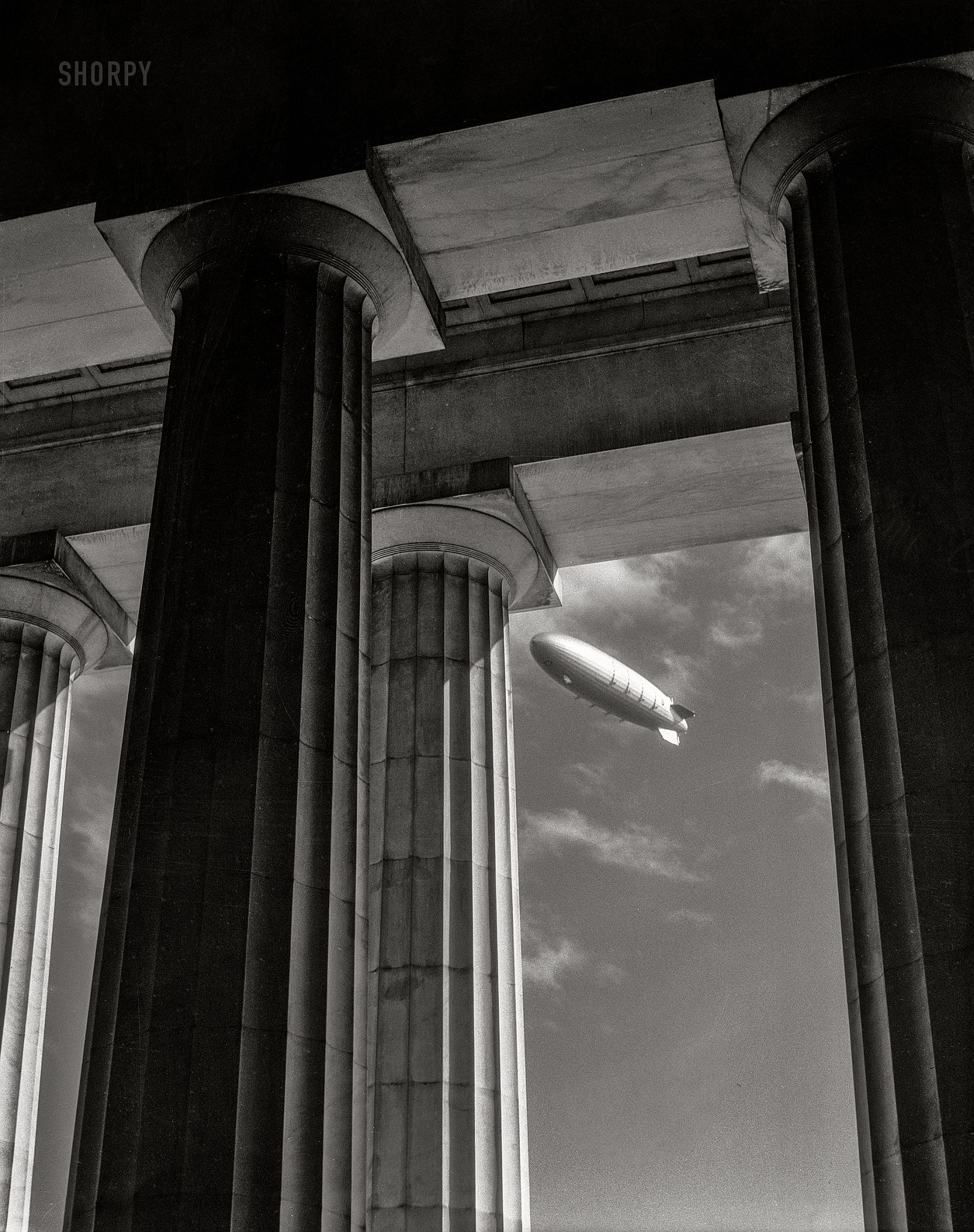 673k | The Lincoln Memorial in Washington, D.C., 19 August 1932. 4x5 inch nitrate negative by Theodor Horydczak. "The Navy airship Akron appeared in the morning and after circling the city released several of her small fighting airplanes over Hoover Field. These were later drawn into the hangar constructed on the interior of the airship." |