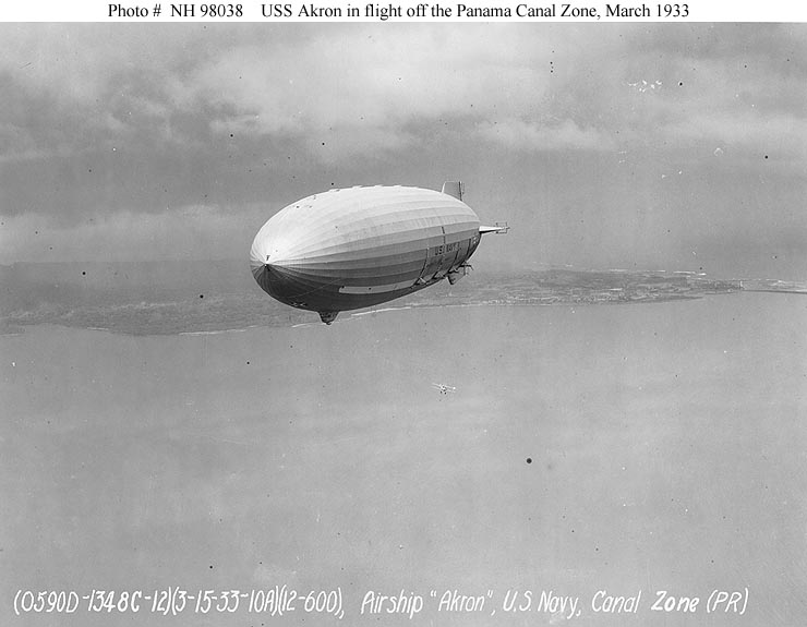 110k | USS Akron (ZRS-4) flying off the Panama Canal Zone, 15 March 1933. The airship's N2Y-1 training plane is suspended in her hangar opening. Official U.S. Army Air Corps Photograph, from the collections of the Naval History and Heritage Command (NH&HC), # NH 98039. |