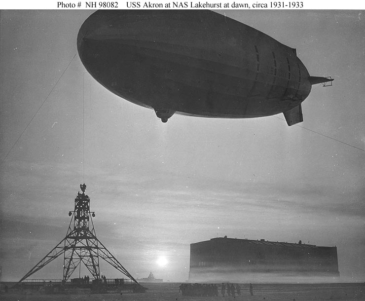 58k | USS Akron (ZRS-4) moored at Naval Air Station Lakehurst, New Jersey, 2 November 1931. Official U.S. Navy photograph, from the collections of the Naval History & Heritage Command (# NH 42158). |