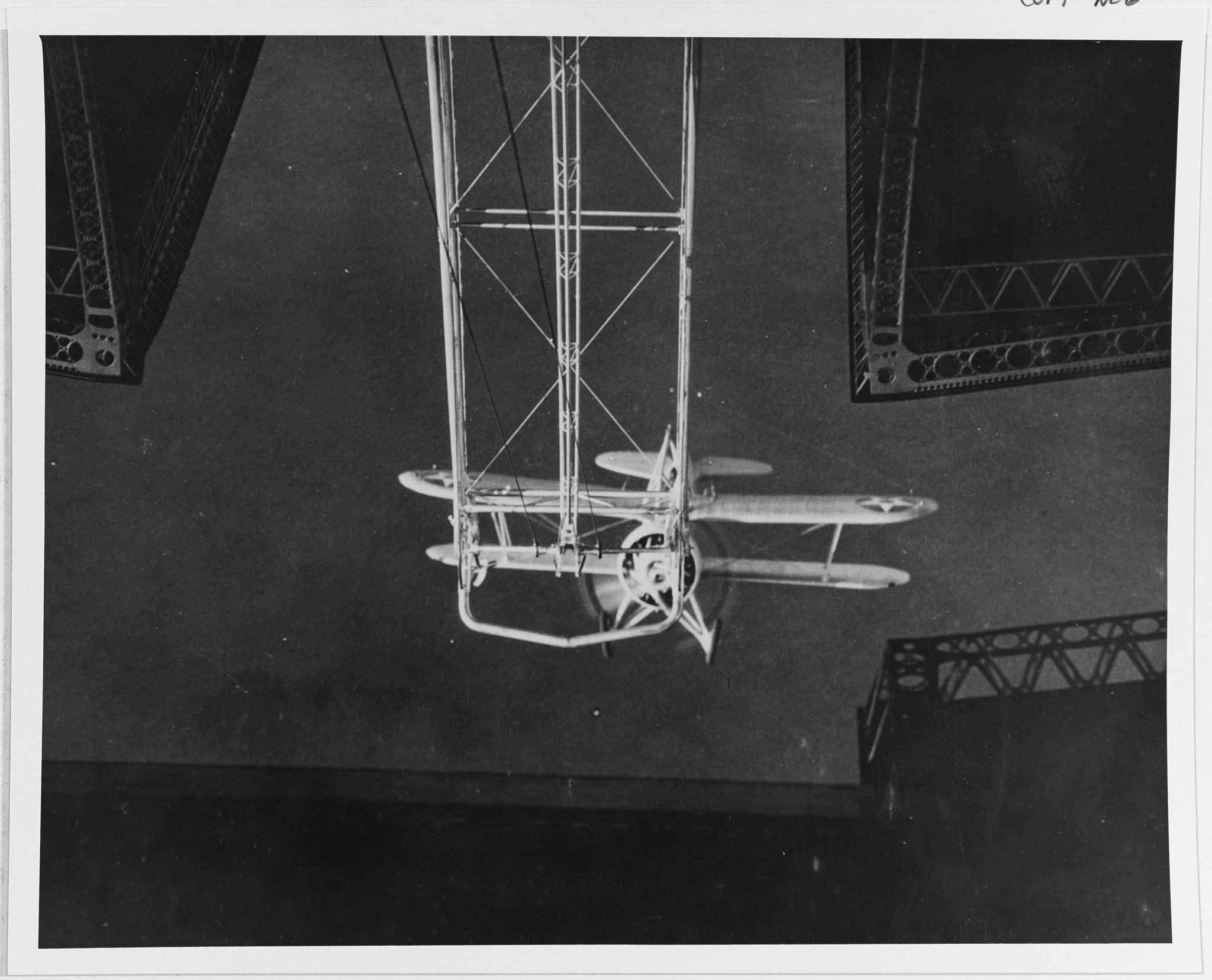 442k | Curtiss XF9C-1 Sparrowhawk (#A8731) is lifted into the hangar of USS Akron (ZRS-4), after hooking onto the airship's trapeze landing gear, 3 May 1932. Photographed during exercises over the Atlantic Ocean near Naval Air Station Lakehurst, New Jersey. Pilot is Lieutenant Howard L. Young. Official U.S. Navy Photograph, now in the collections of the National Archives and Records Administration (photo # 80-G-416534). |