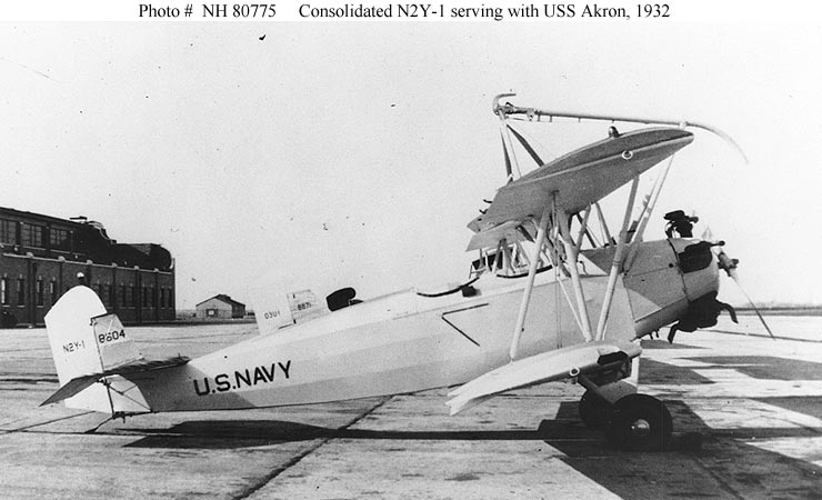 62k | Consolidated N2Y-1 training plane (Bureau # 8604) photographed while serving as "hook-on" familiarization trainer for USS Akron (ZRS-4), 1932. An O3U-1 (Bureau # 8871) is in the background. Courtesy of Richard K. Smith, author of the book The Airships Akron & Macon, 1974. U.S. Naval History & Heritage Command photograph (# NH 80775). |