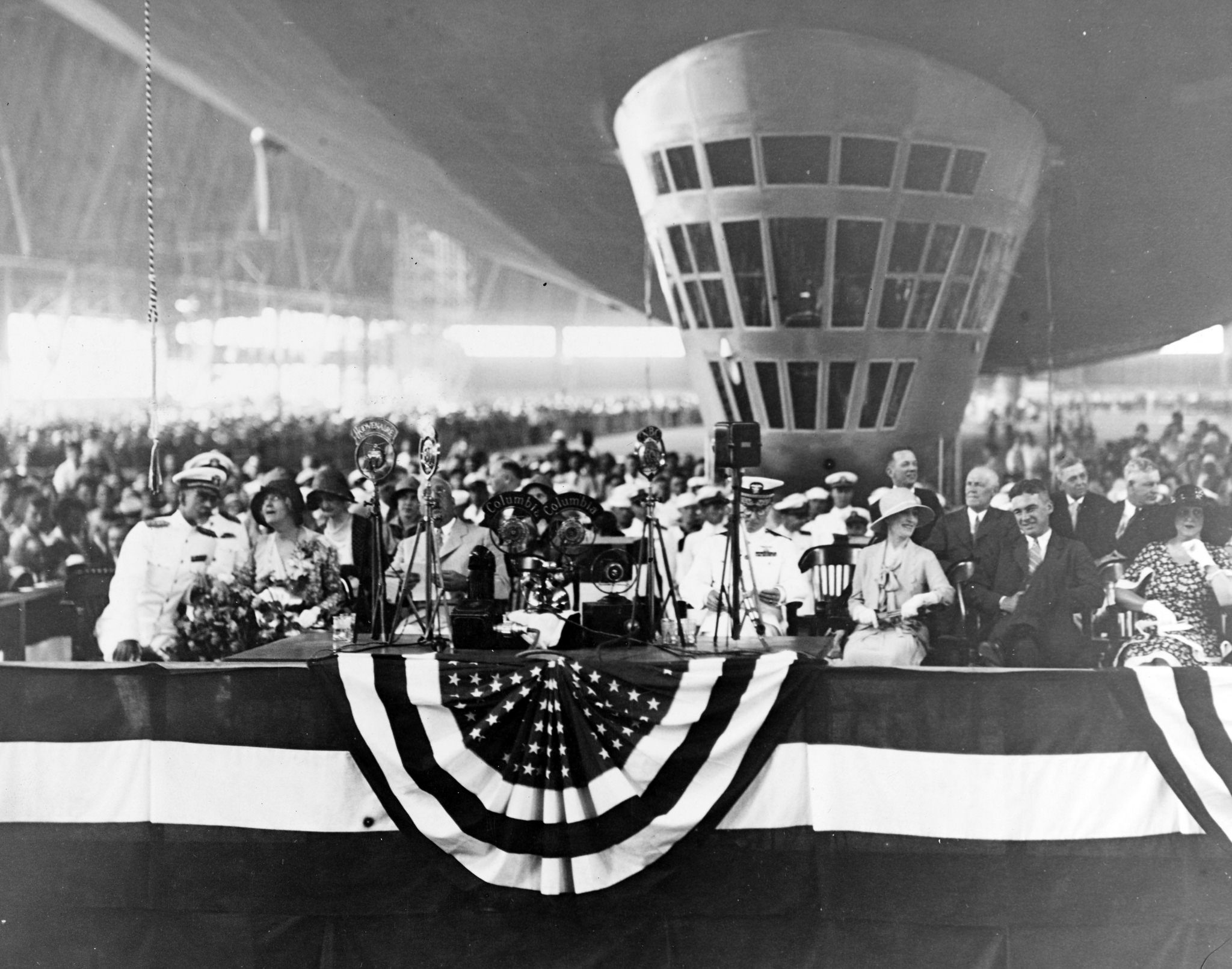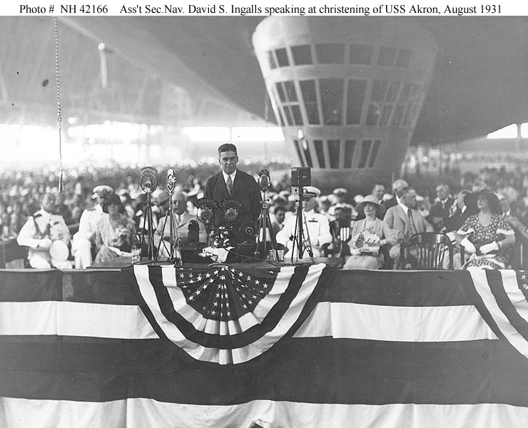 84k | Christening of the future USS Akron (ZRS-4), 8 August 1931. David S. Ingalls, Assistant Secretary of the Navy for Aviation, speaking during Akron's christening ceremonies, held in the Goodyear-Zeppelin Corporation "air dock" hangar at Akron, Ohio. Photograph received from the Navy Recruiting Bureau, 1932. U.S. Naval History & Heritage Command photograph (# NH 42166). |