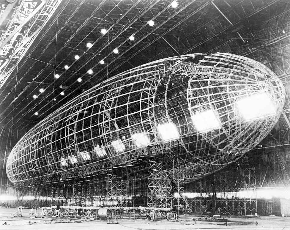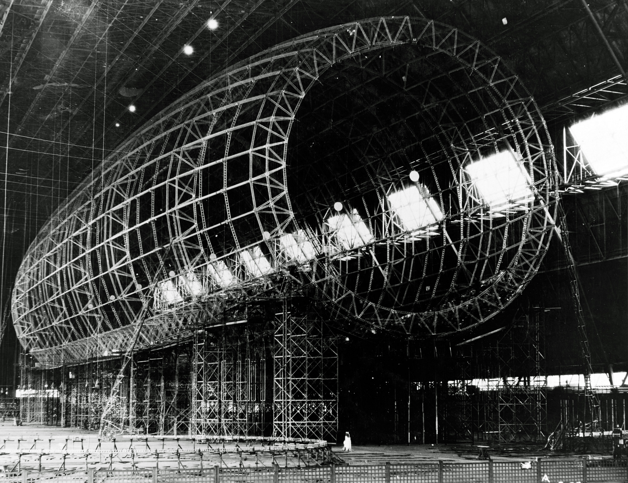 456k | The metallic skeleton of the airship USS Akron (ZRS-4) is shown during construction at the Goodyear Zeppelin Factory in Akron, Ohio, 30 December 1930 Goodyear-Zeppelin Corporation archives photo 2067-A. (Thanks to Hendrick Stoops for providing additional information.) Library of Congress (LoC) photo, Reproduction Number LC-USZ62-74685. |