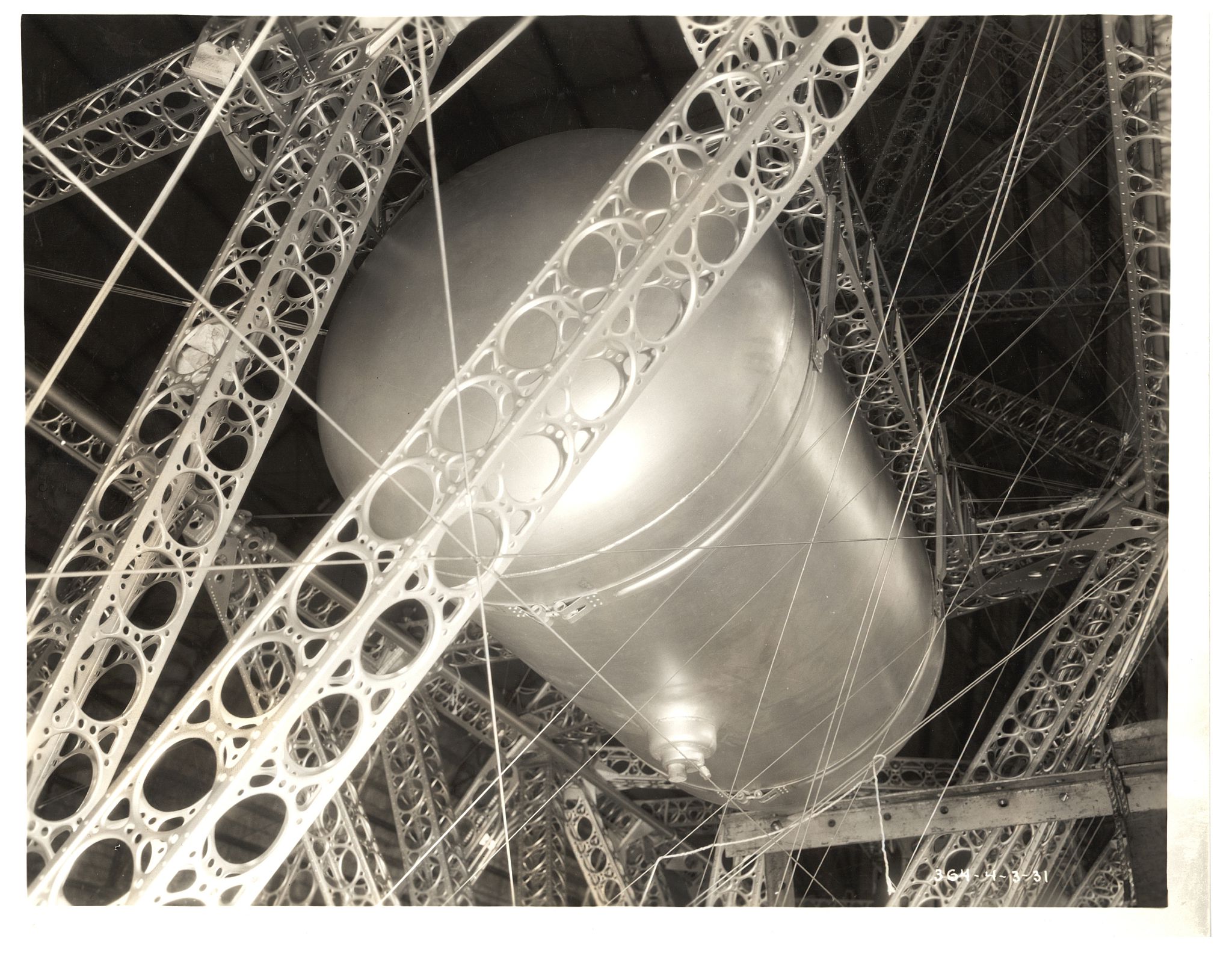 690k | Original Caption: "Photograph of the Interior Hull of a Dirigible before Gas Cells were Installed, ca. 1933." Note that this photo is often shown upside down and mirrored. Actual date is 28 June 1931. This is Goodyear-Zeppelin Corporation archives photo 738-B. (Thanks to Hendrick Stoops for the additional information.) |