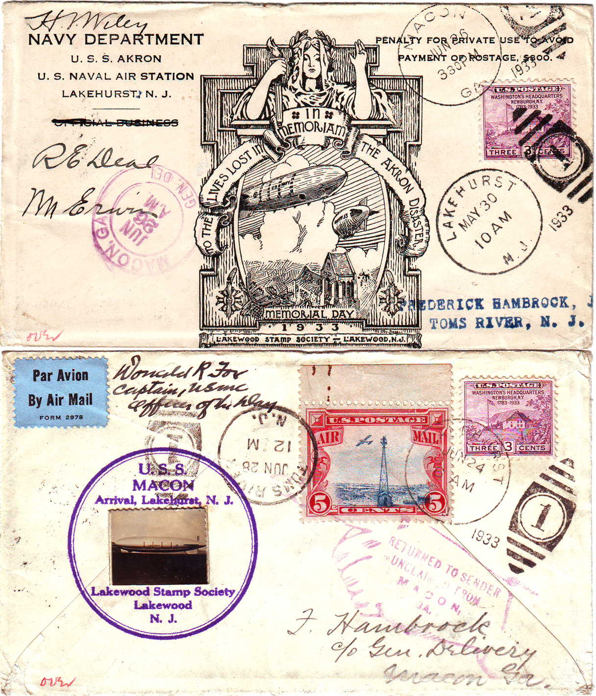 2.31M | USS Akron (ZRS-4) Memorial cover autographed by crewmen LCDR Herbert V. Wiley (Executive Officer), AM2 Moody Erwin, and BM2 Richard E. Deal, the only three survivors of the ill-fated airship that crashed in the Atlantic Ocean in a weather related accident off the New Jersey coast early on 4 April 1933, with the loss of 73 of the 76 souls on board. Source: The Cooper Collection of Zeppelin Postal History. Image: DigitalImageServices.com. |