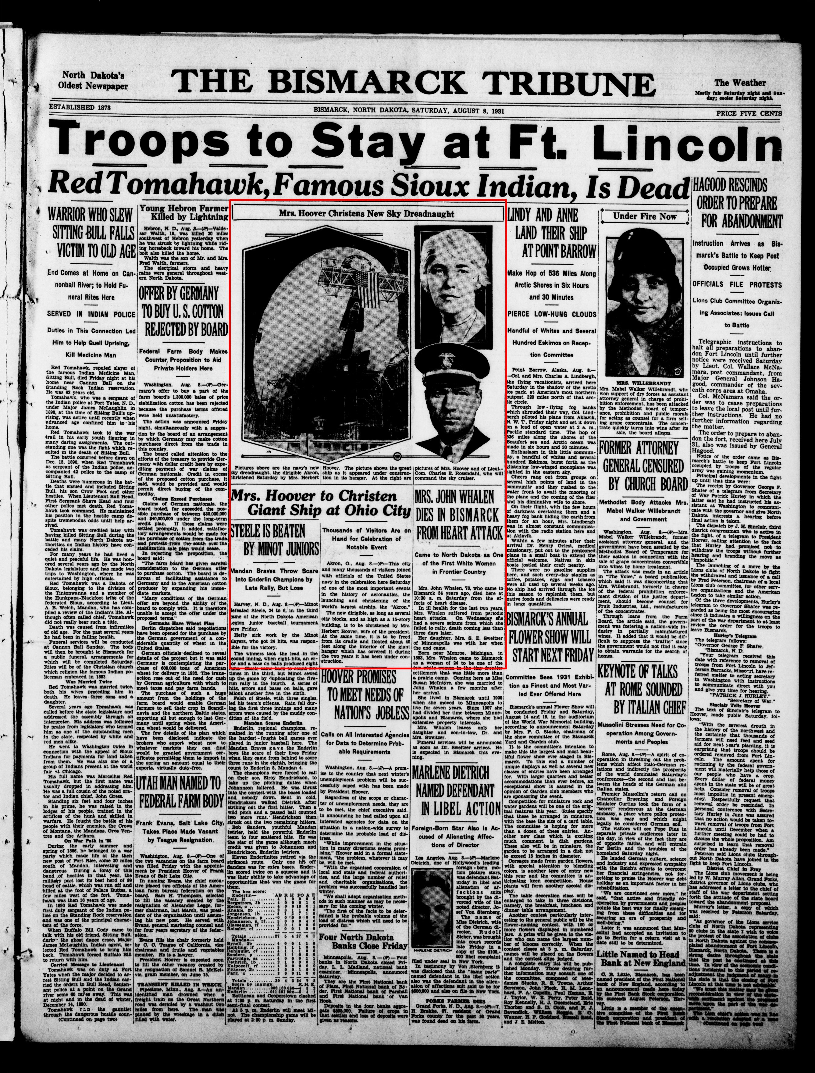 2.42M | "Mrs. Hoover Christens New Sky Dreadnaught—Pictures above are the navy's new sky dreadnaught [sic], the dirigible Akron, christened Saturday by Mrs. Herbert Hoover. The picture shows the great ship as it appeared under construction in its hangar. At the right are pictures of Mrs. Hoover and of Lieut. Com. Charles E. Rosendahl, who will command the sky cruiser." "Mrs. Hoover to Christen Giant Ship at Ohio City—Thousands of Visitors Are on Hand for Celebration of Notable Event—Akron, O., Aug. 8—(AP)—This city and many thousands of visitors joined with officials of the United States navy in the celebration here Saturday of one of the most important events in the history of aeronautics, the launching and christening of the world's largest airship, the Akron." "The new dirigible, as long as several city blocks, and as high as a 15-story building, is to be christened by Mrs. Herbert Hoover, wife of the president. At the same time, it is to be freed from its cradle and floated about 40 feet along the interior of the giant hangar which has covered it during the two years it has been under construction." The Bismarck Tribune, Bismarck, North Dakota, Saturday, 8 August 1931. |