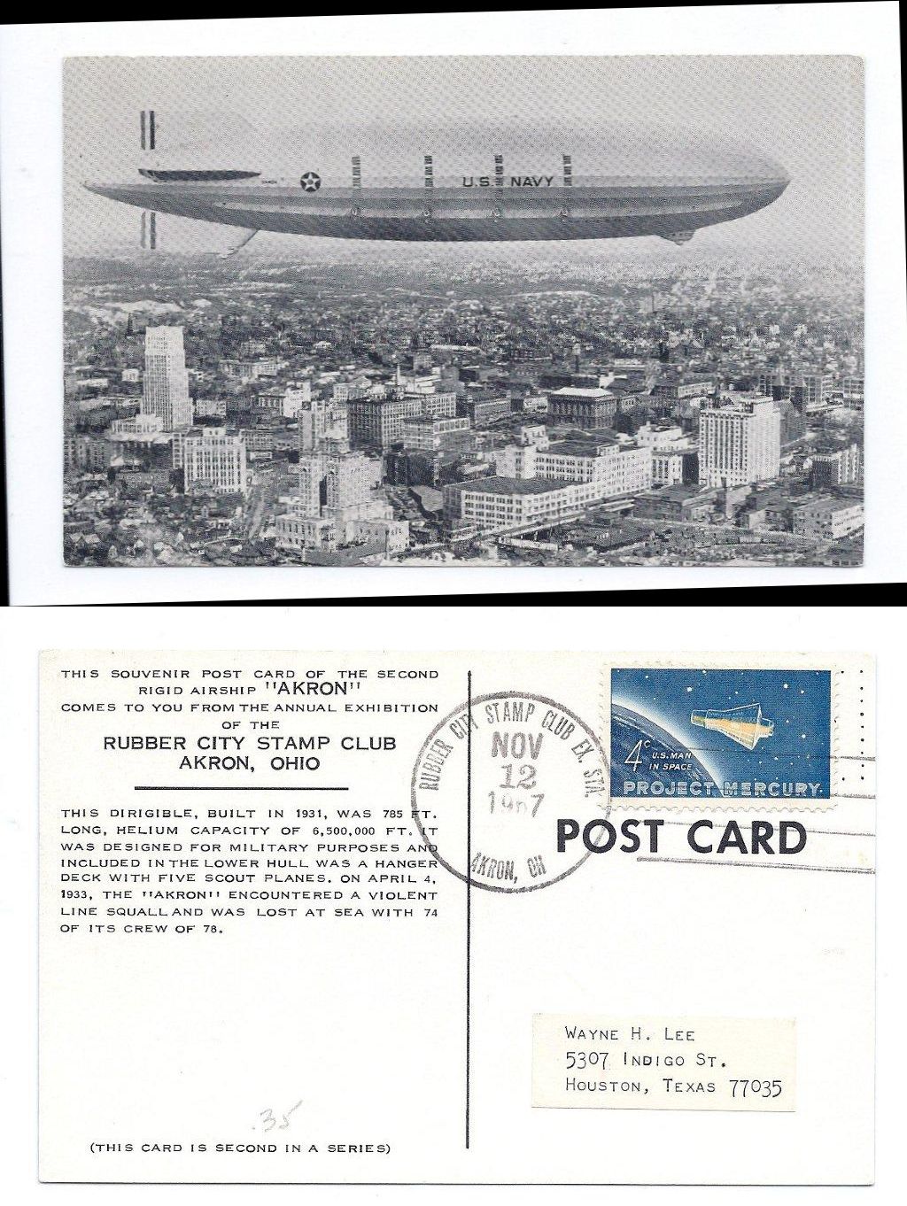 291k | "This souvenir post card of the second rigid airship Akron comes to you from the annual exhibition of the Rubber City Stamp Club, Akron, Ohio" "This dirigible, built in 1931, was 785 ft. long, helium capacity of 6,500,000 ft. It was designed for military purposes and included in the lower hull was a hanger [sic] deck with five scout planes. On April 4, 1933, the Akron encountered a violent line squall and was lost at sea with 74 of its crew of 78." "(This card is second in a series)" Postcard. Stamped on 12 November 1967. |