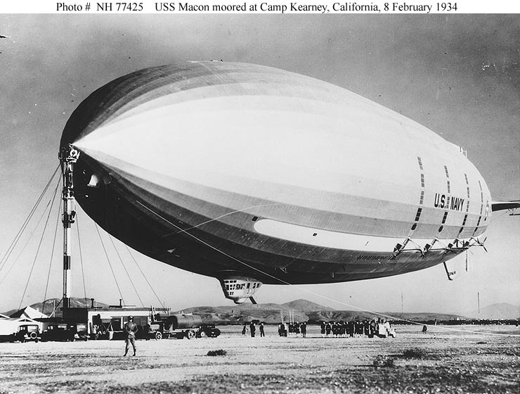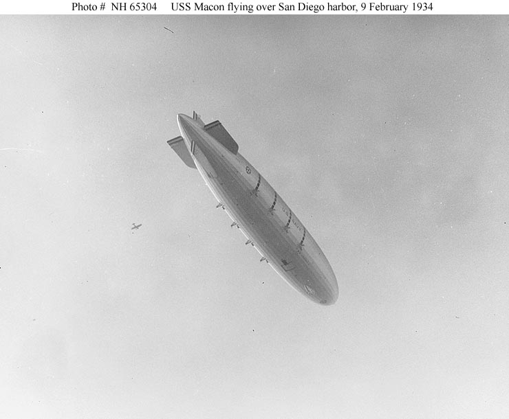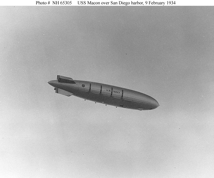 62k | USS Macon (ZRS-5) in flight over San Diego harbor, California, 9 February 1934. Photographed from USS Dobbin (AD-3). Donation of Franklin Moran, 1967. Naval History & Heritage Command photo (# NH 65305). |