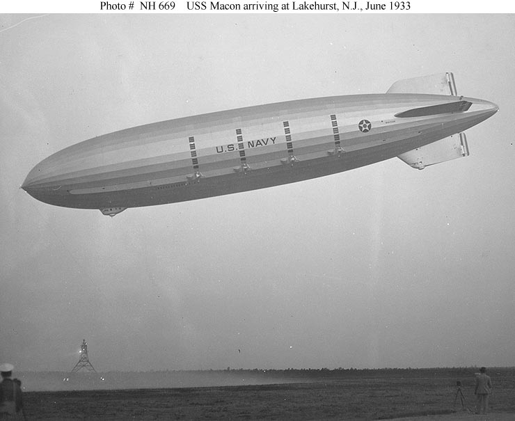 48k | USS Macon (ZRS-5) arriving at Naval Air Station Lakehurst, New Jersey, after her delivery flight from Akron, Ohio, 24 June 1933. Note the light ground haze over the field. Naval History & Heritage Command photo (# NH 669). |