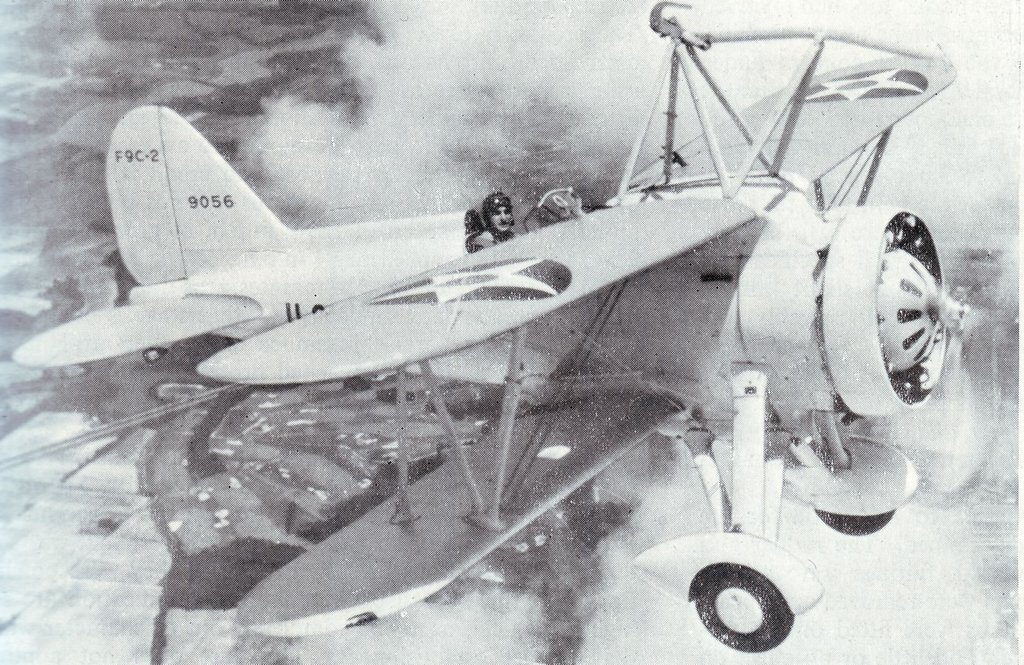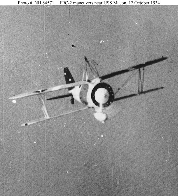 88k | Curtiss F9C-2 Sparrowhawk fighter, with its landing gear removed for airship operations, maneuvers near USS Macon (ZRS-5), while being filmed by Fox Movietone News cameras on 12 October 1934. The plane's pilot was Lieutenant (Junior Grade) Frederick N. Kivette, USN. Courtesy of Richard K. Smith, author of the book The Airships Akron & Macon, 1974. Naval History & Heritage Command photo (# NH 84571). |