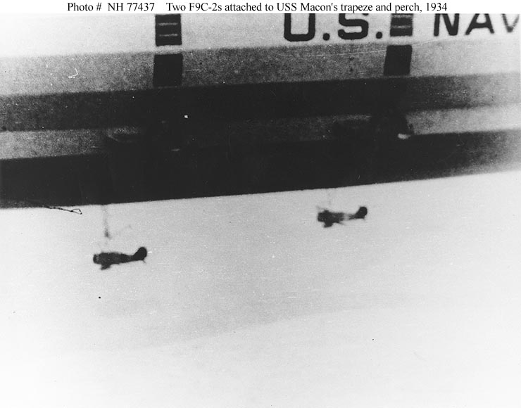 521k | Curtiss F9C-2 Sparrowhawk fighter (Bureau # 9057), piloted by Lieutenant D. Ward Harrigan, USN, hanging from the trapeze of USS Macon (ZRS-5) during flight operations in 1933. Official U.S. Navy photograph, now in the collections of the National Archives and Records Administration (NARA), photo # 80-G-441979. |