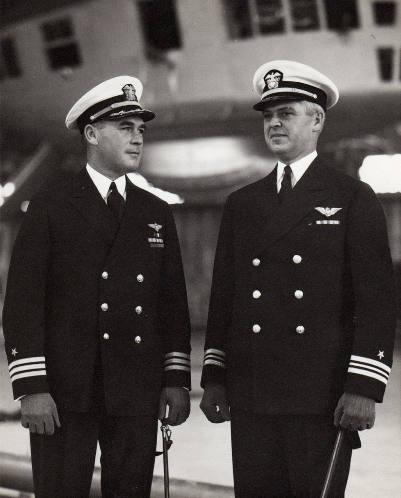 137k | LCDR Herbert V. Wiley, right, relieves CDR Alger H. Dresel as commanding officer of USS Macon (ZRS-5), 11 July 1934. | Bill Gonyo & Ron Reeves |