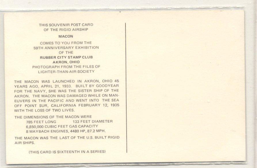 121k | "This souvenir post card of the rigid airship Macon comes to you from the 59th Anniversary Exhibition of the Rubber City Stamp Club, Akron, Ohio. Photograph from the files of Lighter-Than-Air Society." "The Macon was launched in Akron, Ohio 45 years ago, April 21, 1933. Built by Goodyear for the Navy, she was the sister ship of the Akron. The Macon was damaged while on maneuvers in the Pacific and went into the sea off Point Sur, California February 12, 1935 with the loss of two lives." "The dimensions of the Macon were: "The Macon was the last of the U.S. built rigid air ships." "(This card is sixteenth in a series)" |