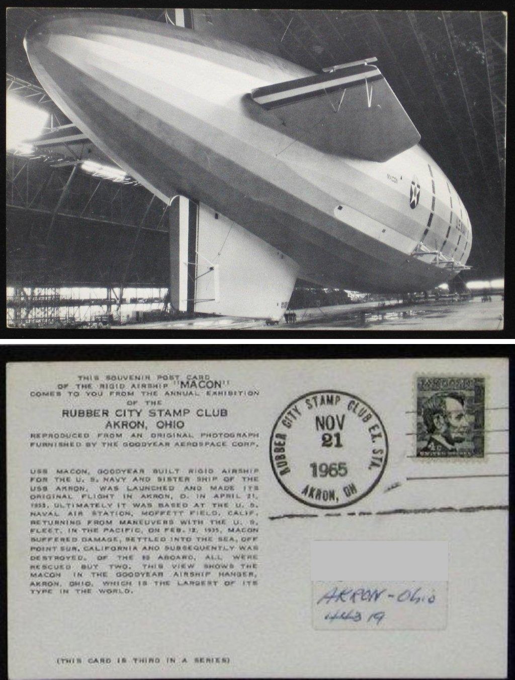 228k | "This souvenir post card of the rigid airship Macon comes to you from the annual exhibition of the RUBBER CITY STAMP CLUB, AKRON, OHIO. Reproduced from an original photograph furnished by the Goodyear Aerospace Corp." "USS Macon, Goodyear built rigid airship for the U.S. Navy and sister ship of the USS Akron, was launched and made its original flight in Akron, O. in April 21, 1933. Ultimately it was based at the U.S. Naval Air Station, Moffett Field, Calif. Returning from maneuvers with the U.S. Fleet, in the Pacific, on Feb. 12, 1935, Macon suffered damage, settled into the sea, off Point Sur, California and subsequently was destroyed. Of the 83 aboard, all were rescued but two. This view shows the Macon in the Goodyear Airship Hanger, Akron, Ohio, which is the largest of its type in the world." "(This card is third in a series)" Dated Nov. 21, 1965. |