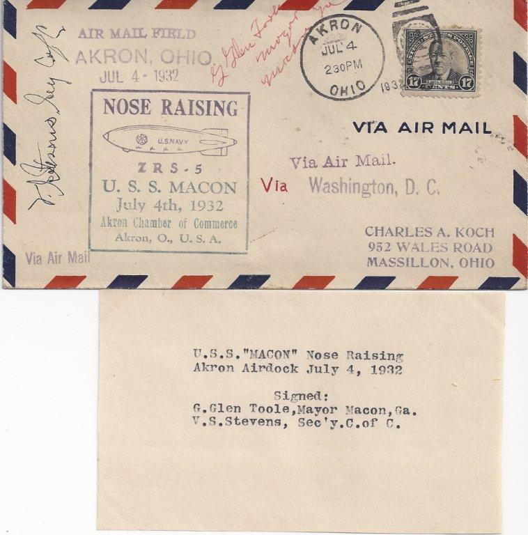 92k | "U.S.S. Macon Nose Raising — Akron Airdock July 4, 1932" "Signed: — G. Glen Toole, Mayor Macon, Ga. — V.S. Stevens, Sec'y.C.of C." |