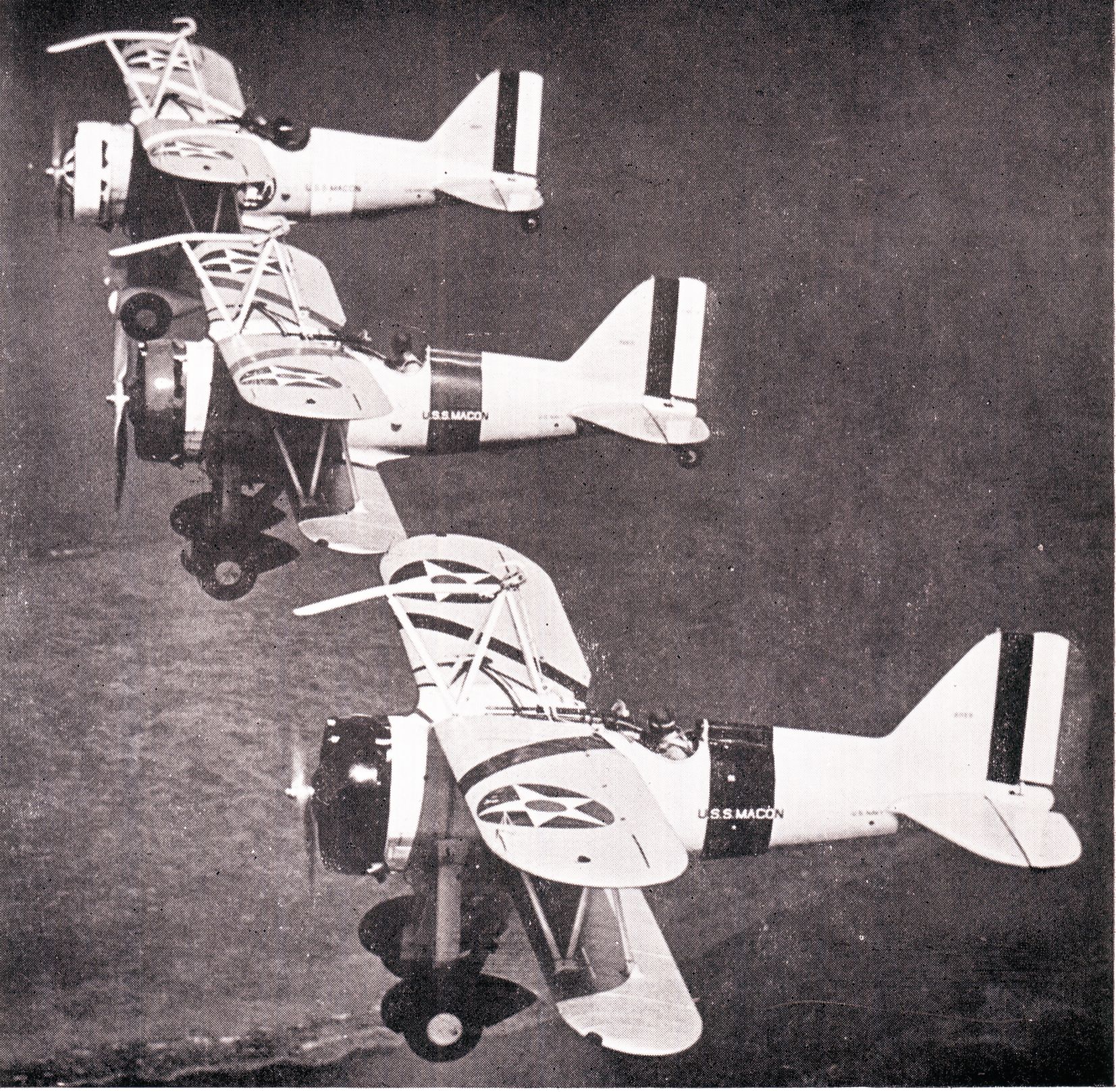 244k | Curtiss F9C-2 Sparrowhawk fighters (including # 9055, at left, and 9057, in lower right) flying in a V formation, circa 1933–1935. These planes were part of the heavier-than-air group of USS Macon (ZRS-5). Naval History & Heritage Command (NH&HC) photo, # NH 71617. |