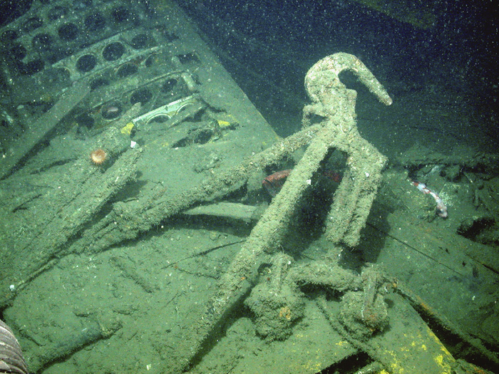 283k | The sky hook located at the center of the Curtiss Sparrowhawk F9C-2 biplanes. During flight, the pilot would position the aircraft below USS Macon's hangar where a trapeze was lowered to hook the plane. Sparrowhawk pilots were nicknamed the "men on the flying trapeze." As seen in the September 2006 expedition. Source: National Oceanic and Atmospheric Administration (NOAA), Photo No. Unknown. |