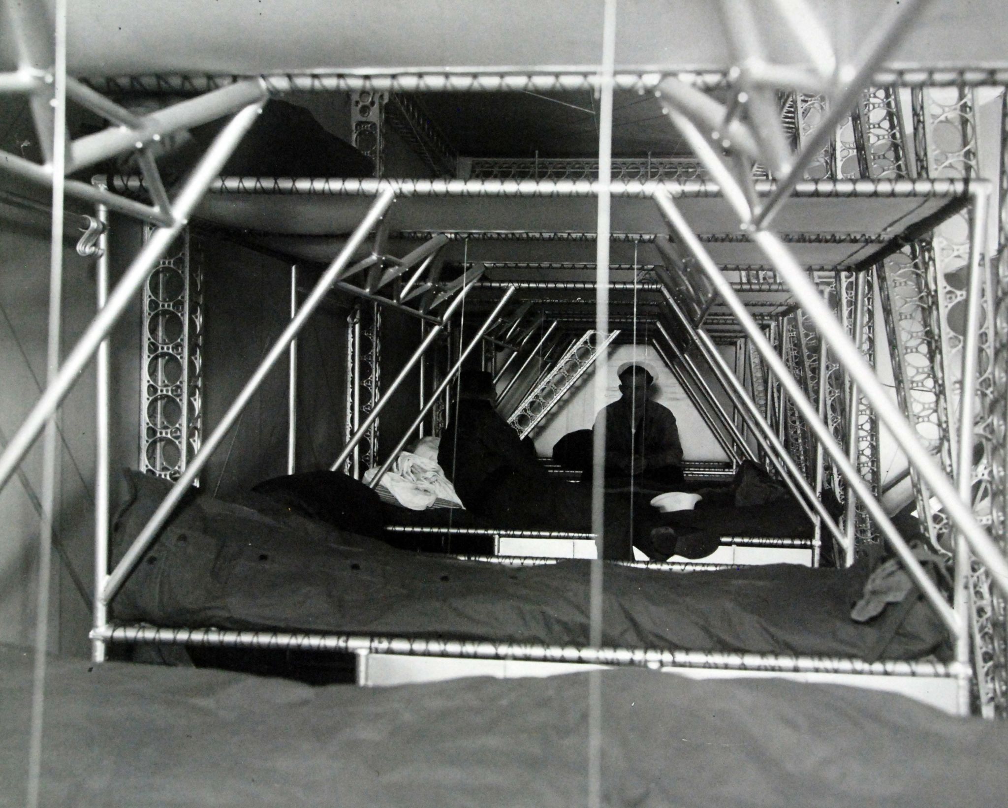 464k | USS Macon (ZRS-5), sleeping quarters on board the lighter-than-air aircraft. Photograph received in 1951. National Archives and Records Administration (NARA) photo, # 80-G-463025. Note: This photo is incorrectly identified as pertaining to USS Akron (ZRS-4). It is Goodyear-Zeppelin Corporation archives photo 298-F, labeled as taken on 20 April 1933. "ZRS-4's bunks were very distinctive from ZRS-5's, with the latter ship's much-reduced design clearly being the result of weight-saving adjustments from the previous ship." Thanks to Hendrick Stoops for providing this information. |