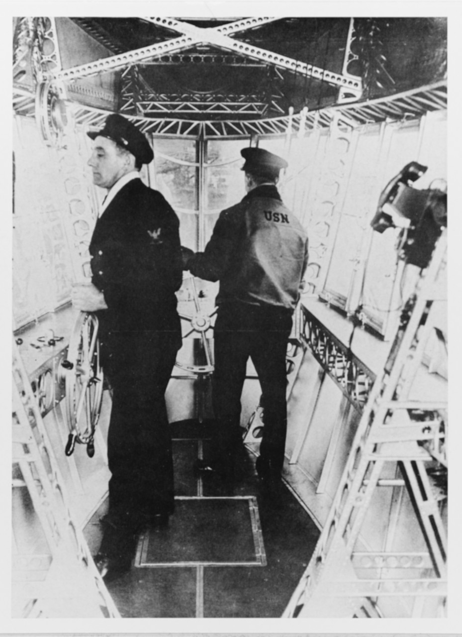 158k | View in the airship's control car, looking forward, while she was in a hangar, circa 1933–1935. This is a halftone reproduction. Naval History & Heritage Command photo (# NH 82711). |