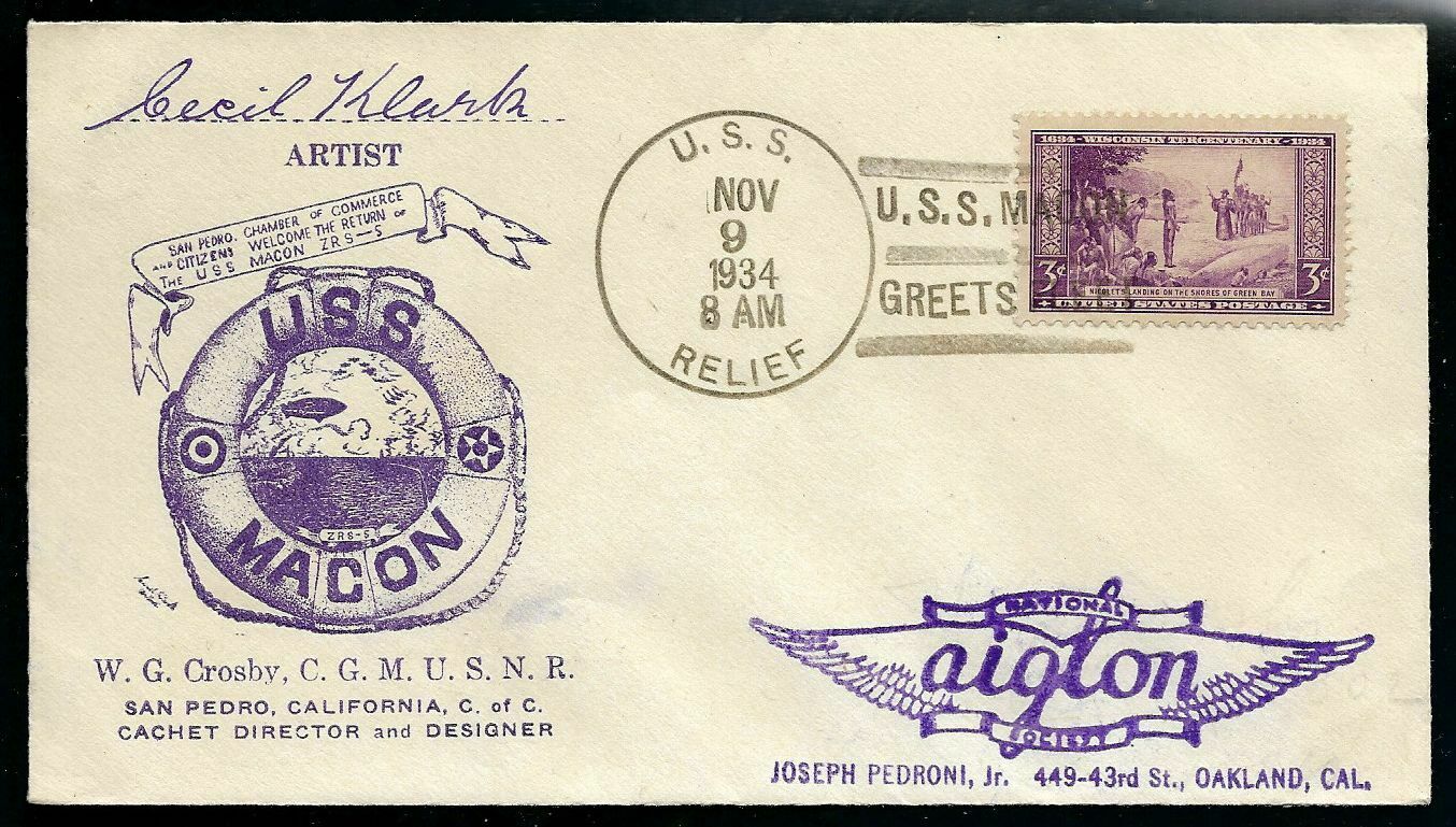 245k | Cancel Type 3 (B-BTT) [Info] Rubber stamp cachet sponsored by the San Pedro Chamber of Commerce. Cachet artist is Cecil Klark. Aboard USS Relief (AH-1), dated 9 November 1934. |