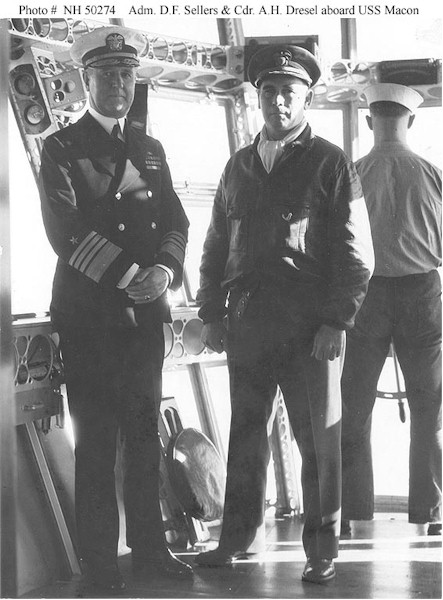 72k | Admiral David F. Sellers, USN (left), Commander-in-Chief, U.S. Fleet, in the control car of USS Macon (ZRS-5) on 9 November 1933, during his visit to the airship for a flight in the vicinity of San Francisco, California. Standing with him is Macon's Commanding Officer, Commander Alger H. Dresel, USN. Naval History & Heritage Command photo (# NH 50274). Note: The date of this photo is sometimes given as 9 November 1934. This is incorrect, since ADM Sellers was relieved as CINCUS in June 1934, and CDR Dresel was relieved as CO of Macon in July that year. |