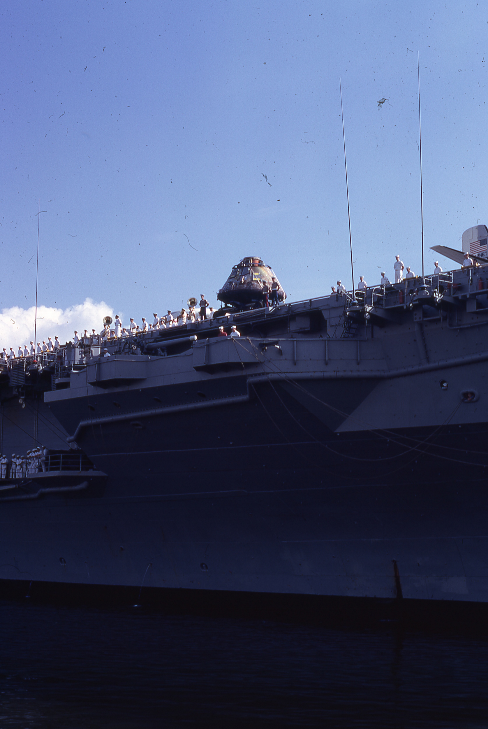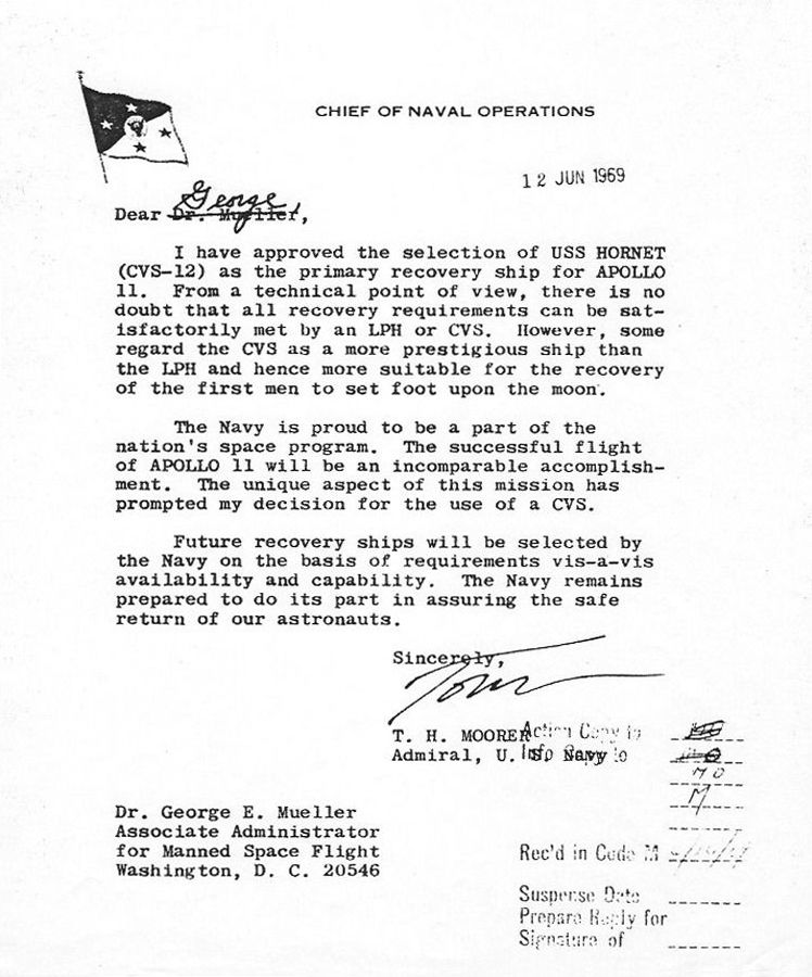 131k | The WWII Essex-class aircraft carrier USS Hornet (CVS-12) was selected as the Primary Recovery Ship (PRS) for the Apollo 11 mission. Because of the Vietnam War, major US Navy combatant vessels in the Pacific Fleet were being carefully scheduled. Hornet had just completed her third (and final) tour off the coast of Vietnam and was available for special assignment. |