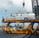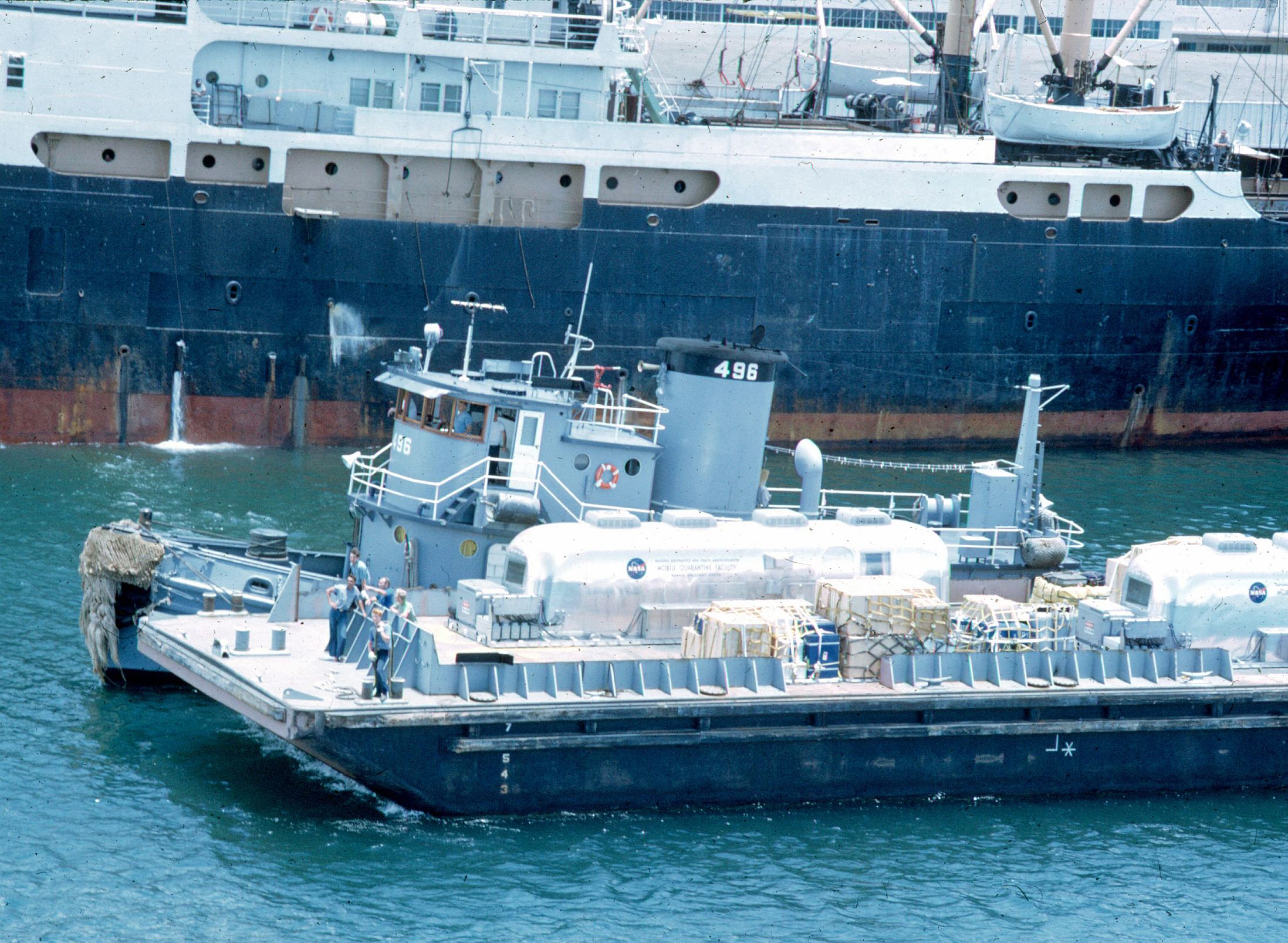 643k | In late June, Hornet steamed to Hawaii and was "chopped" to TF-130. Two Mobile Quarantine Facility (MQF) trailers and other NASA recovery equipment was flown to Pearl Harbor by USAF cargo aircraft and then barged to Hornet's location at the Pearl Harbor Navy Base. US Navy photo. |