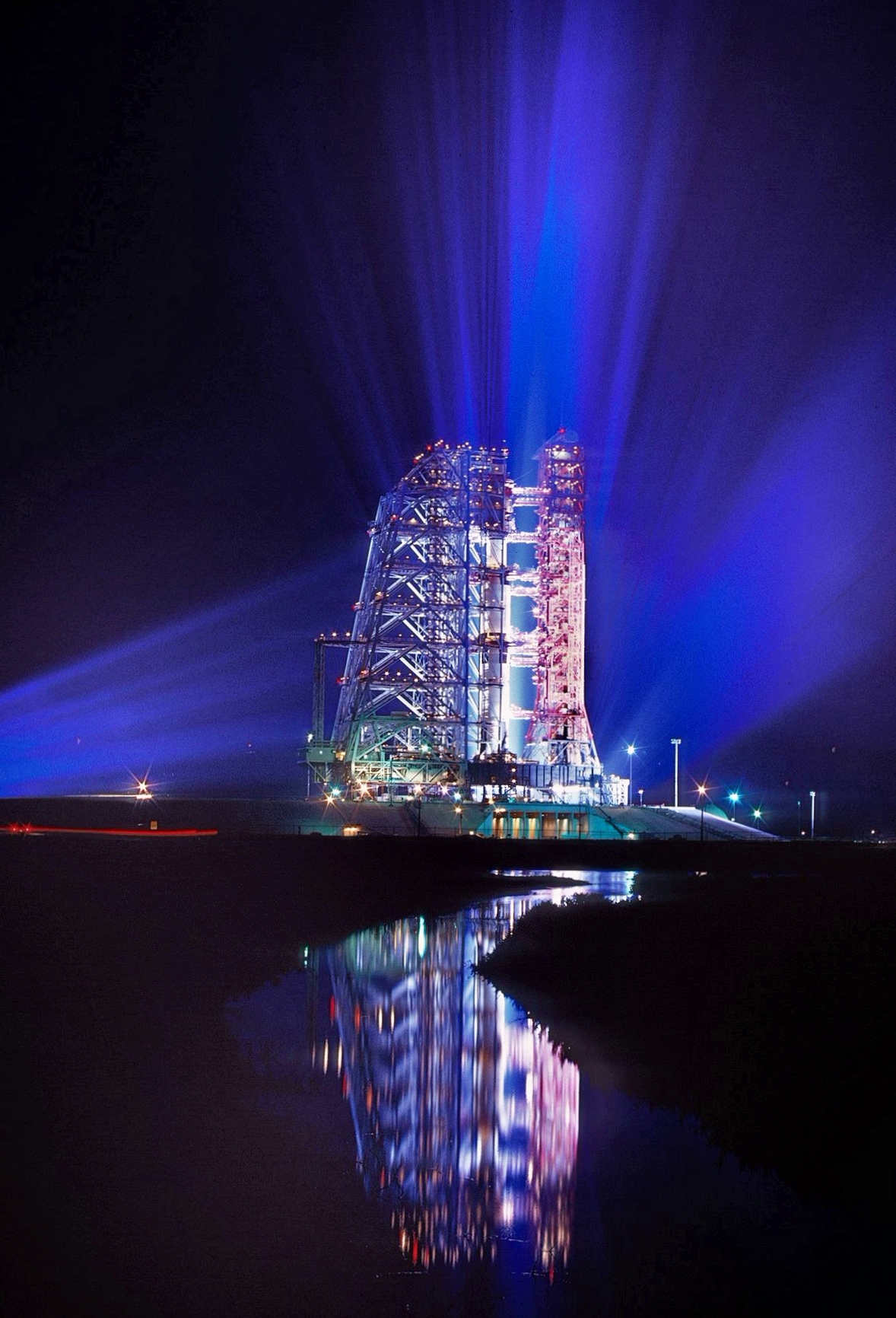 1.17M | Reflected in a pond, the Apollo 11 spacecraft sits high atop the Saturn V rocket on its launch pad on 15 July 1969, the eve of its historic mission to the moon. Photograph by O. Louis Mazzatenta, National Geographic Image Collection. |