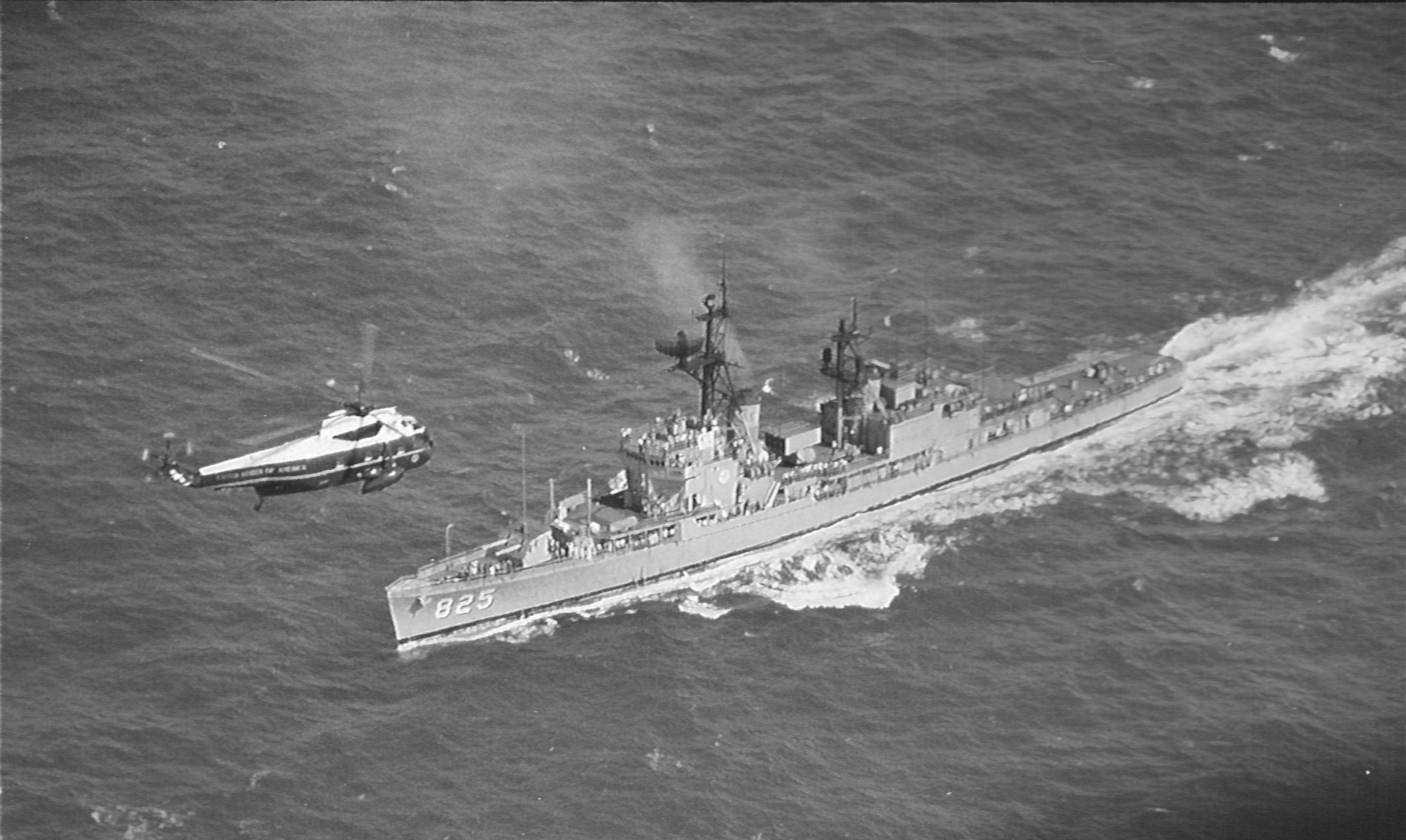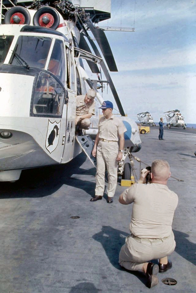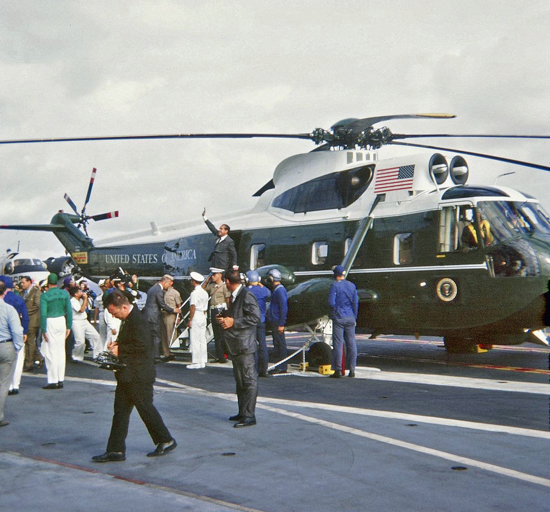 487k | In the early afternoon of 23 July, President Nixon and his party flew by HMX-1 helicopters from Johnston Island to the predicted vicinity of the Apollo 11 splashdown, where a ship awaited their arrival. The destroyer USS Carpenter (DD-825) had been assigned as a navigation aid and rescue ship for the President's flight. As a salute to her crewmen, President Nixon (a naval officer in WWII) had his pilot, Colonel Ed Sample, do a "fly-by" overflight. USMC photo by Dan McDyre. |