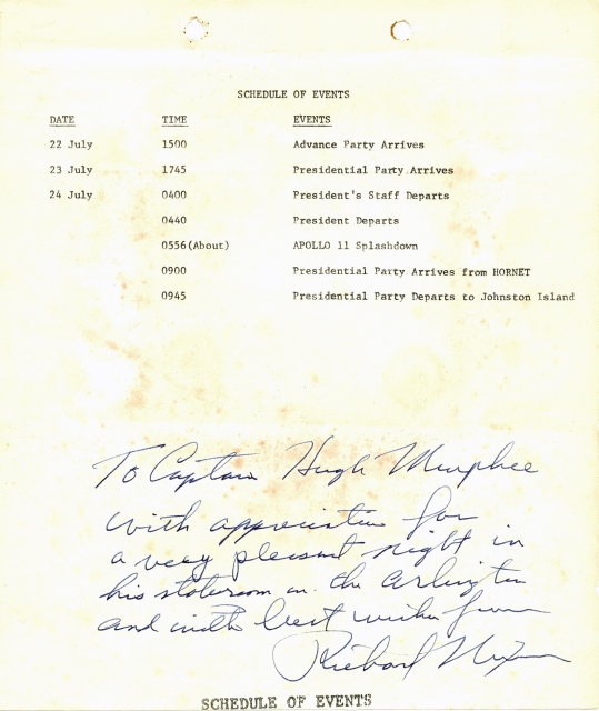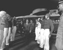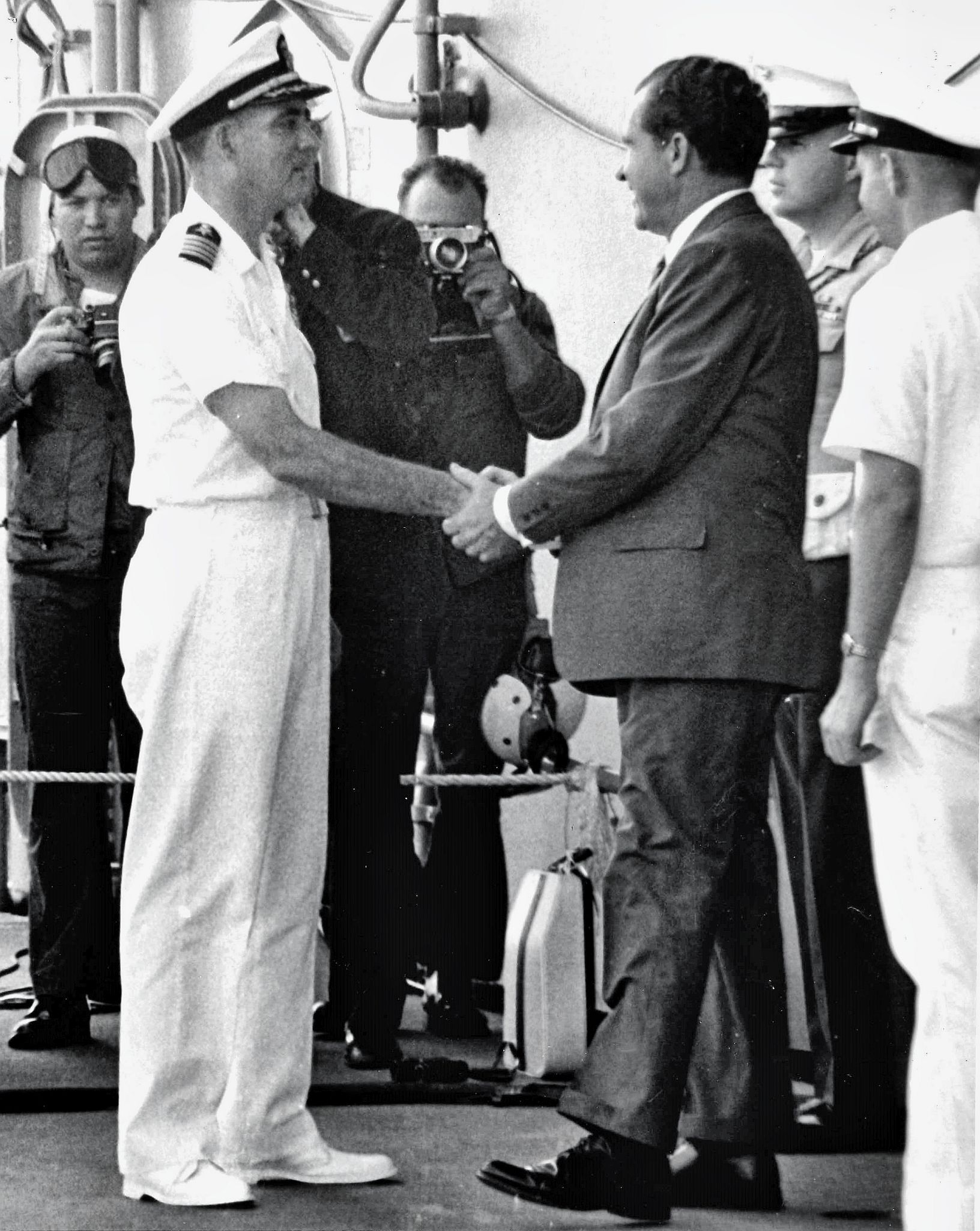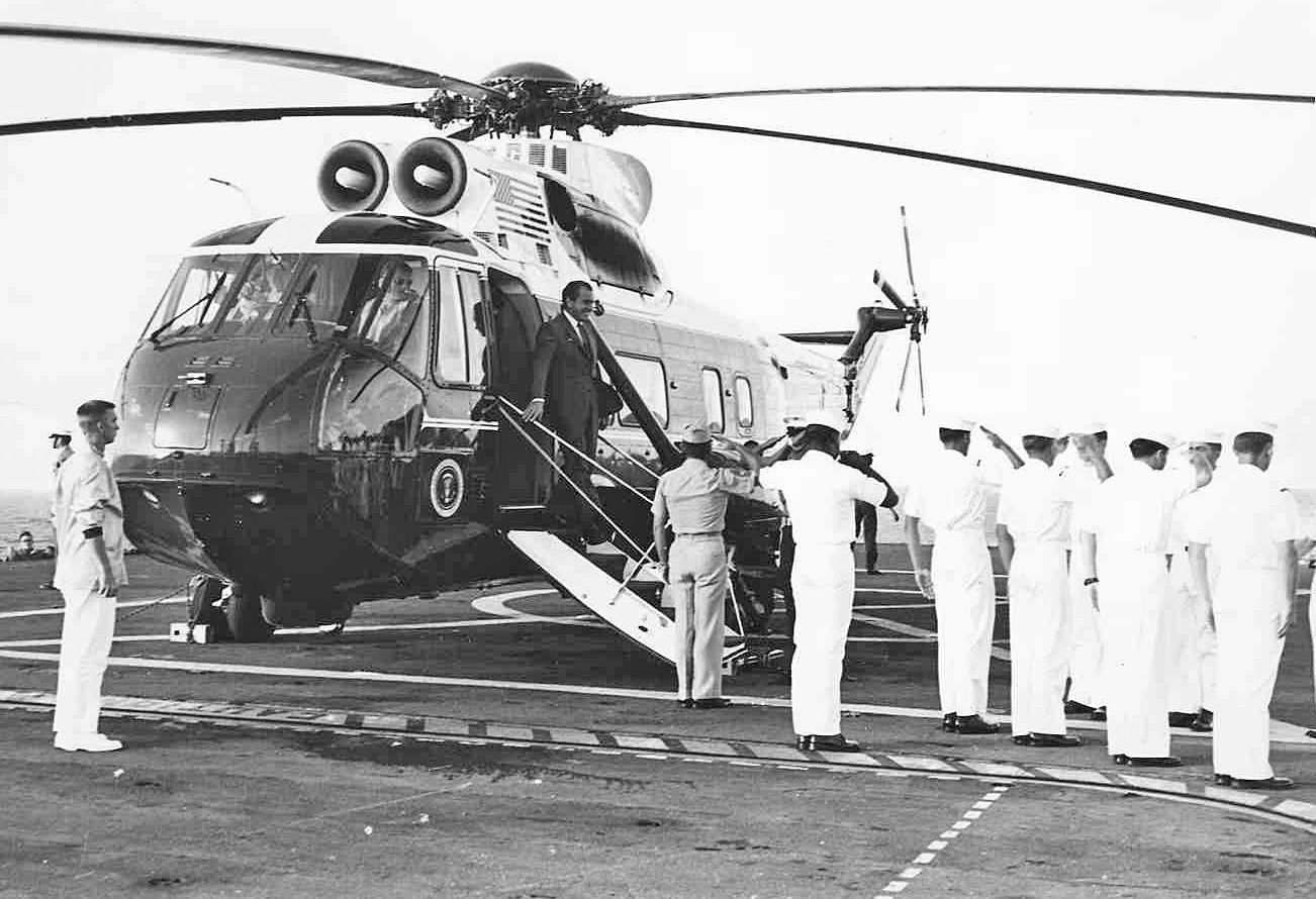 404k | President Richard Nixon arrived aboard USS Hornet (CVS-12) at 0512 on 24 July 1969. He and his party were honored with a traditional "side boy" salute before being greeted by Commander In Chief, Pacific (CINCPAC) Admiral John S. McCain, Jr., and Hornet Commanding Officer CAPT Carl J. Seiberlich. National Aeronautics and Space Administration (NASA) photo, # 6900597. |