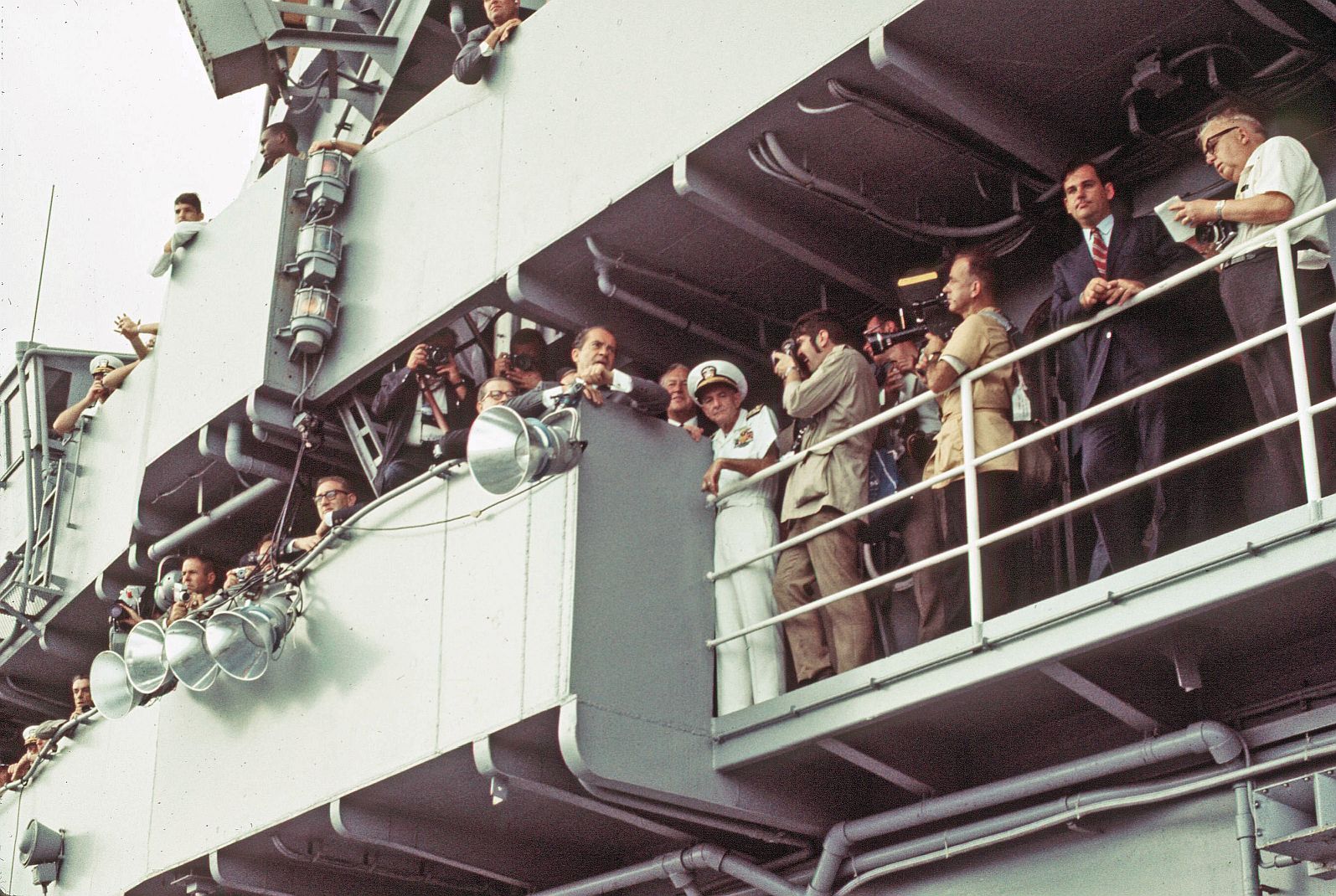 376k | President Nixon spent 15 minutes on the Flag Bridge, candidly chatting with members of the media and various ship's crewmen, thoroughly enjoying the moment. At 0544, the sonic boom of the spacecraft dropping below the sound barrier alerted the ship to its impending arrival. The president watched the following astronaut recovery activities from this spot. History buffs should be able to identify Harry R. Haldeman, Assistant to the President and (White House) Chief of Staff; Henry A. Kissinger, Assistant to the President for National Security Affairs; Richard M. Nixon, President of the United States; Admiral John S. McCain, Jr., Commander-in-Chief, US Pacific Command; and Ron Ziegler, White House Press Secretary. US Navy photo. |