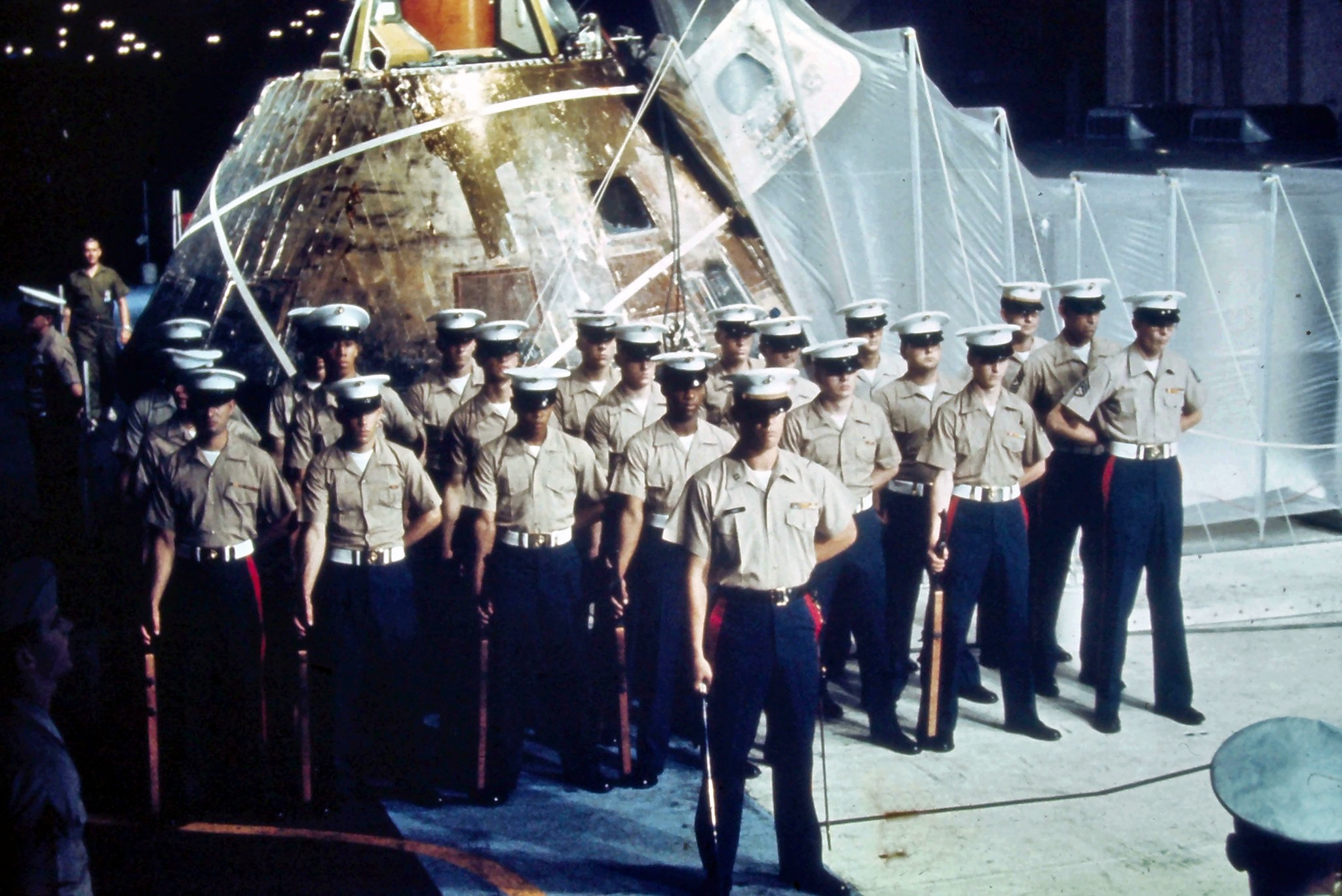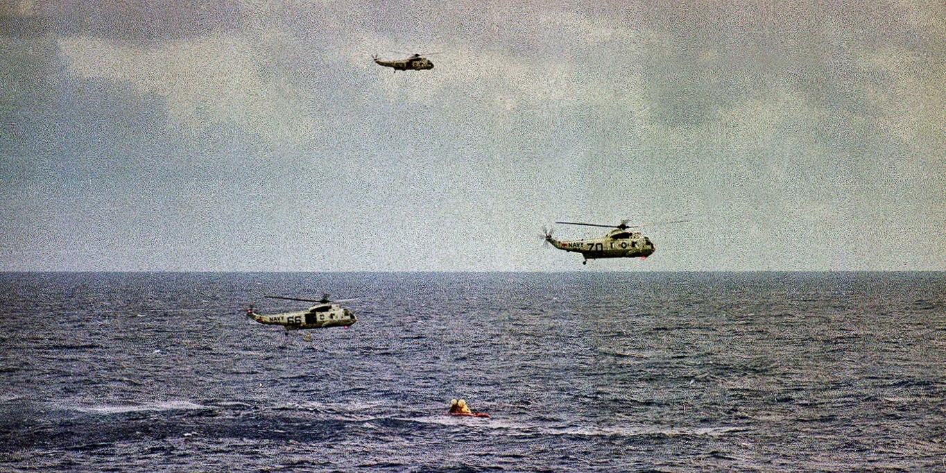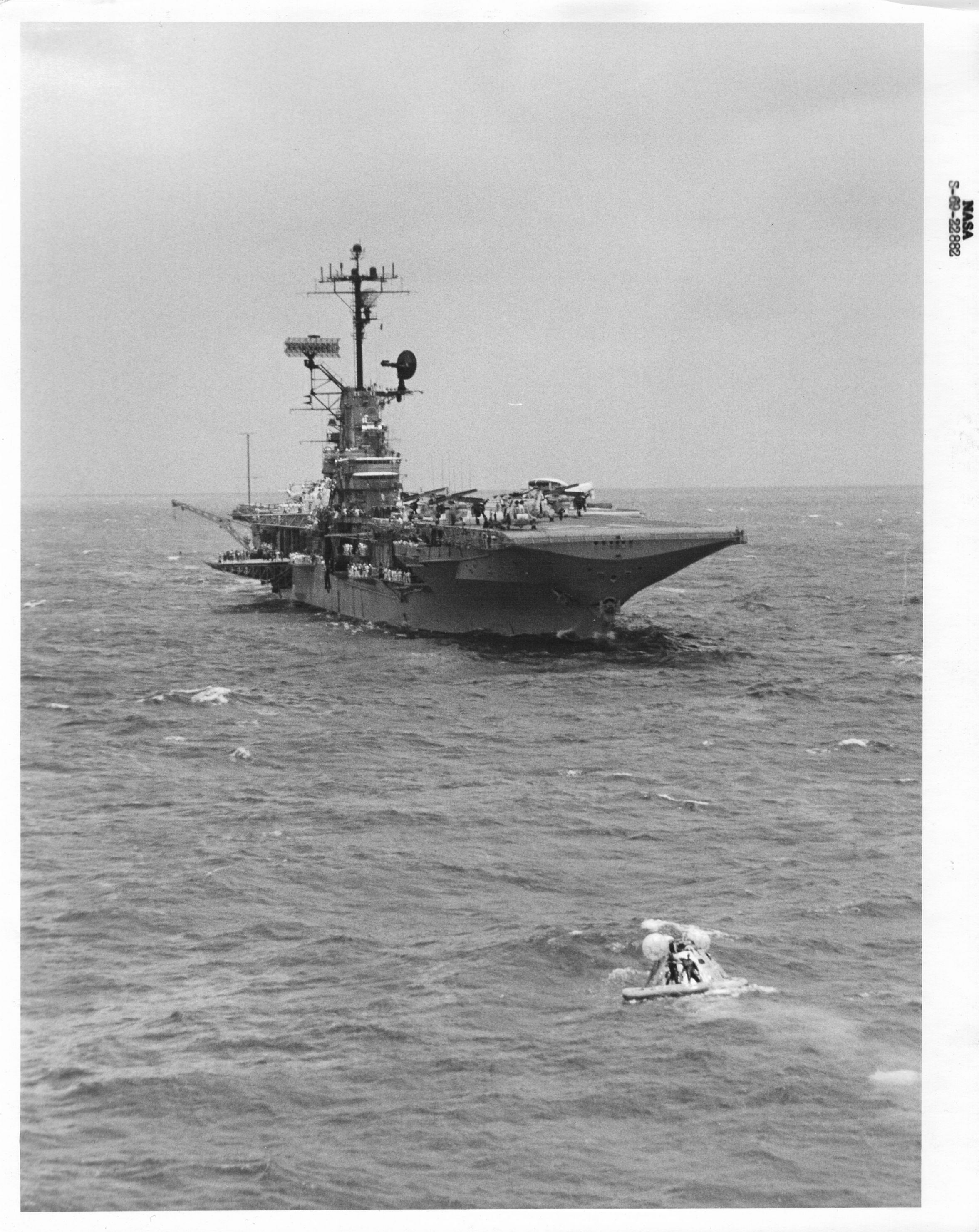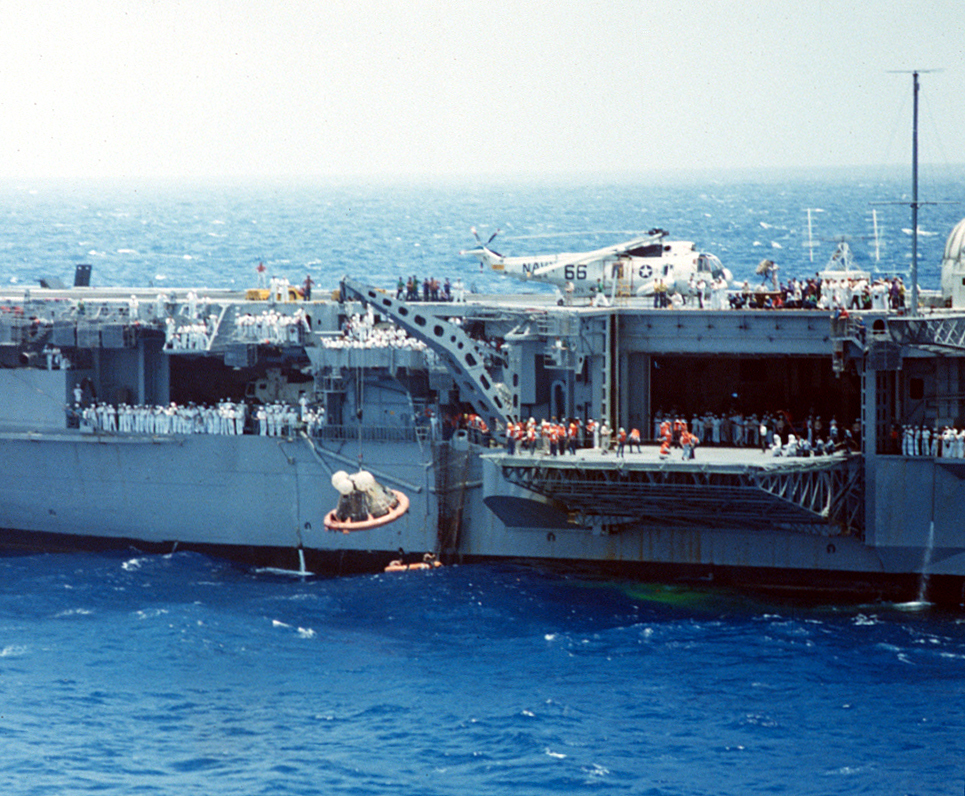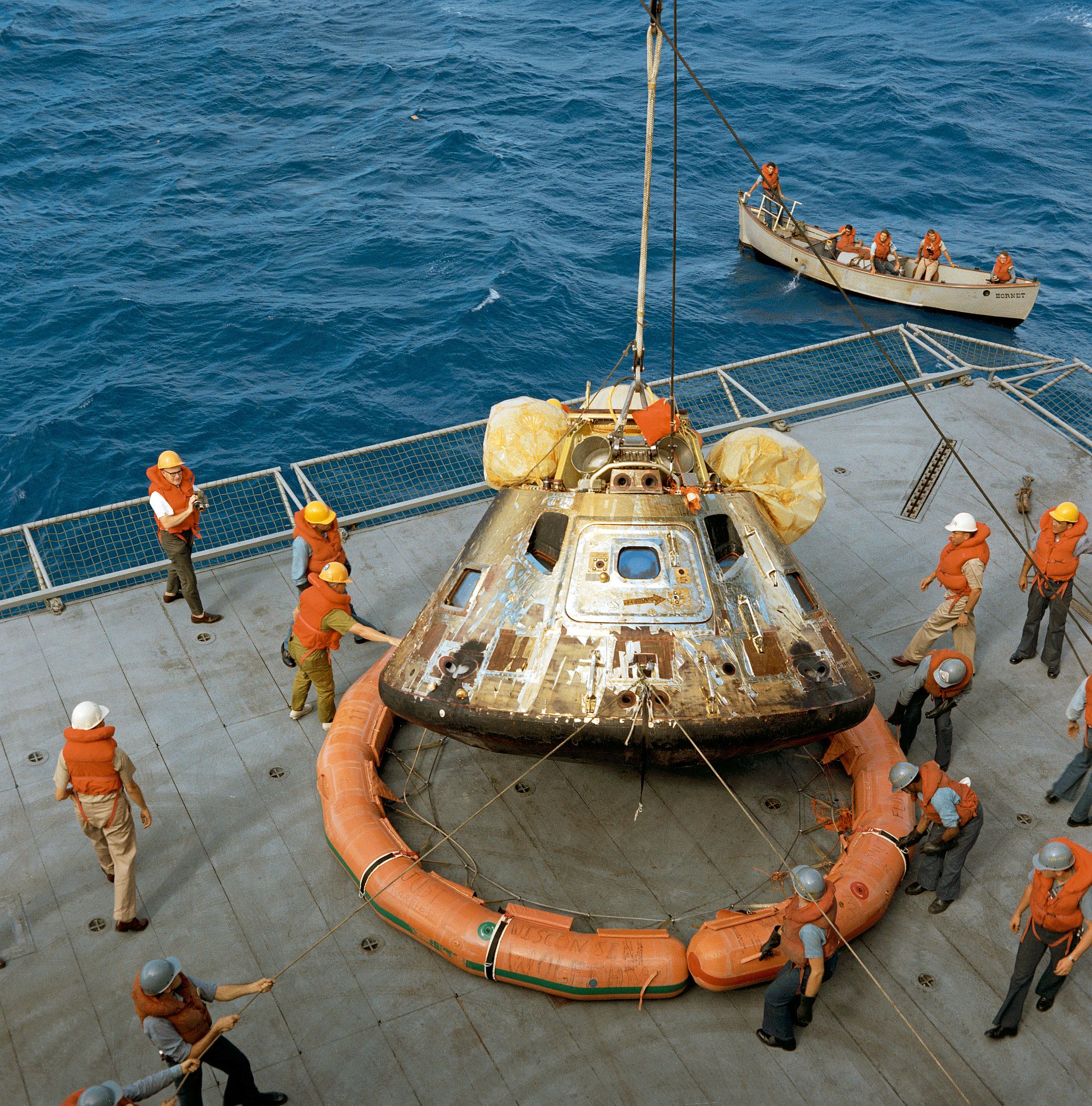 571k | USS Hornet (CVS-12) had a long and distinguished lineage in US history starting with World War II. Her immediate predecessor, USS Hornet (CV-8) had launched the famous Doolittle Tokyo Raid in WWII. As an aircraft carrier, she was a very stable platform with redundant propulsion systems, could launch and recover fixed wing aircraft, and had a major medical facility aboard. She was precisely what NASA needed for this epic mission. US Navy photo by LCDR Charles Kerlee, USNR, now in the collections of the National Archives and Records Administration (NARA), # 80-G-469319. (See NS021214 for a description.) |