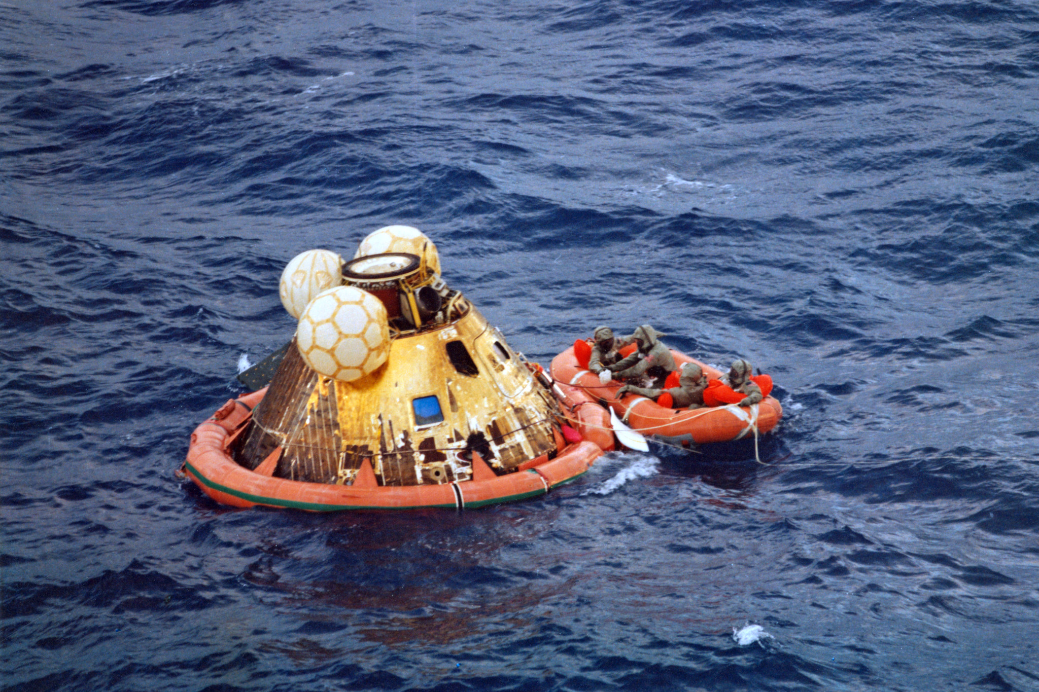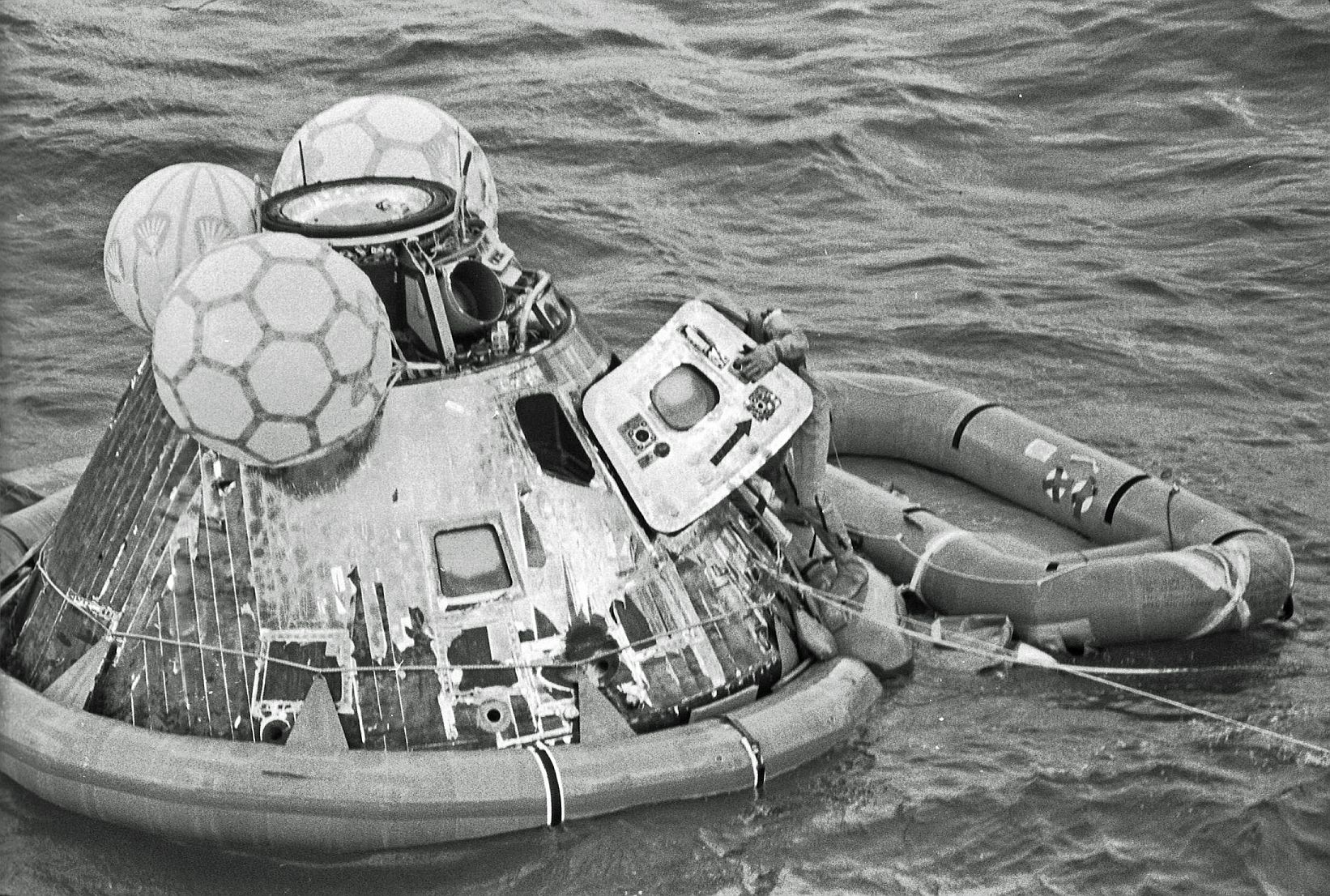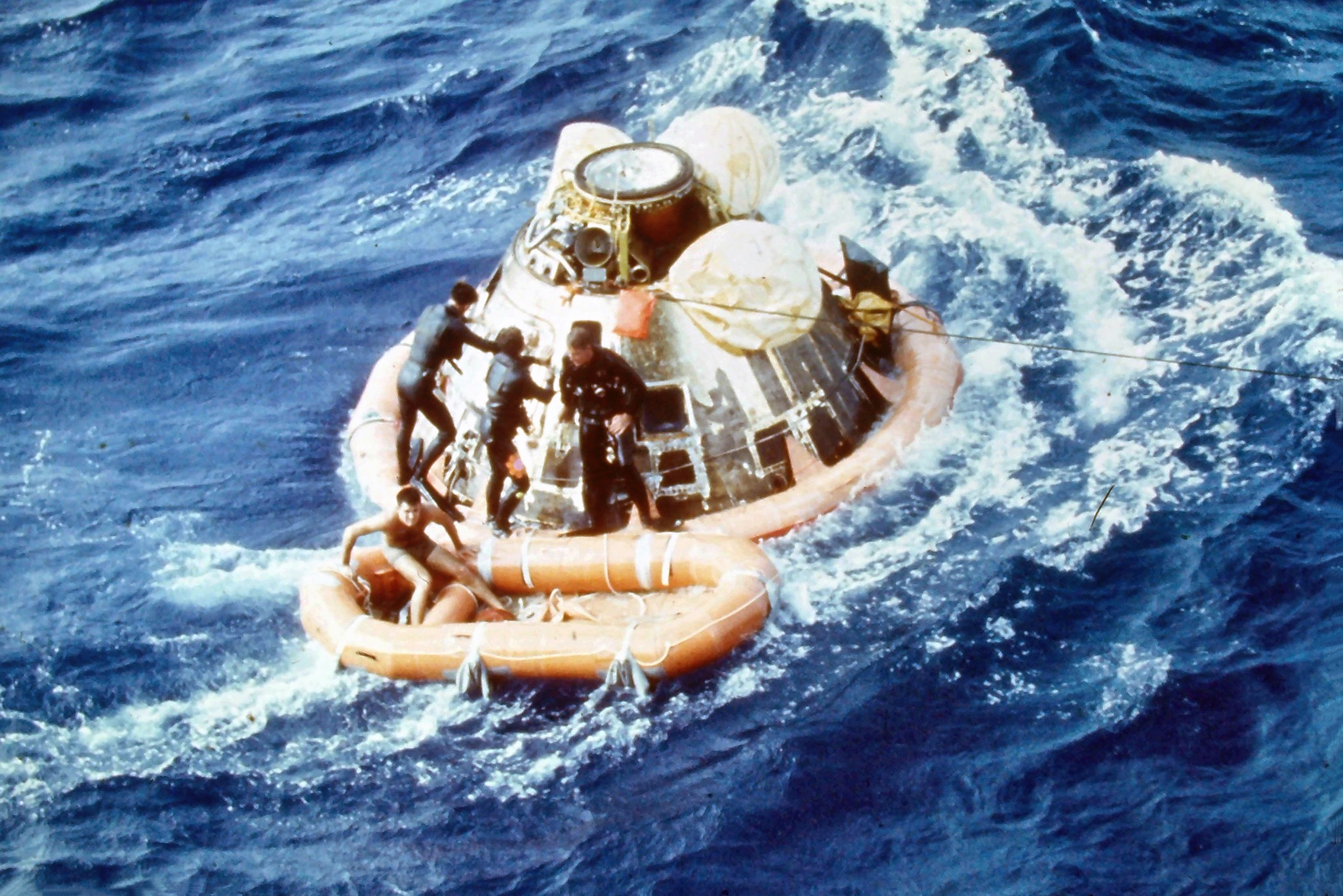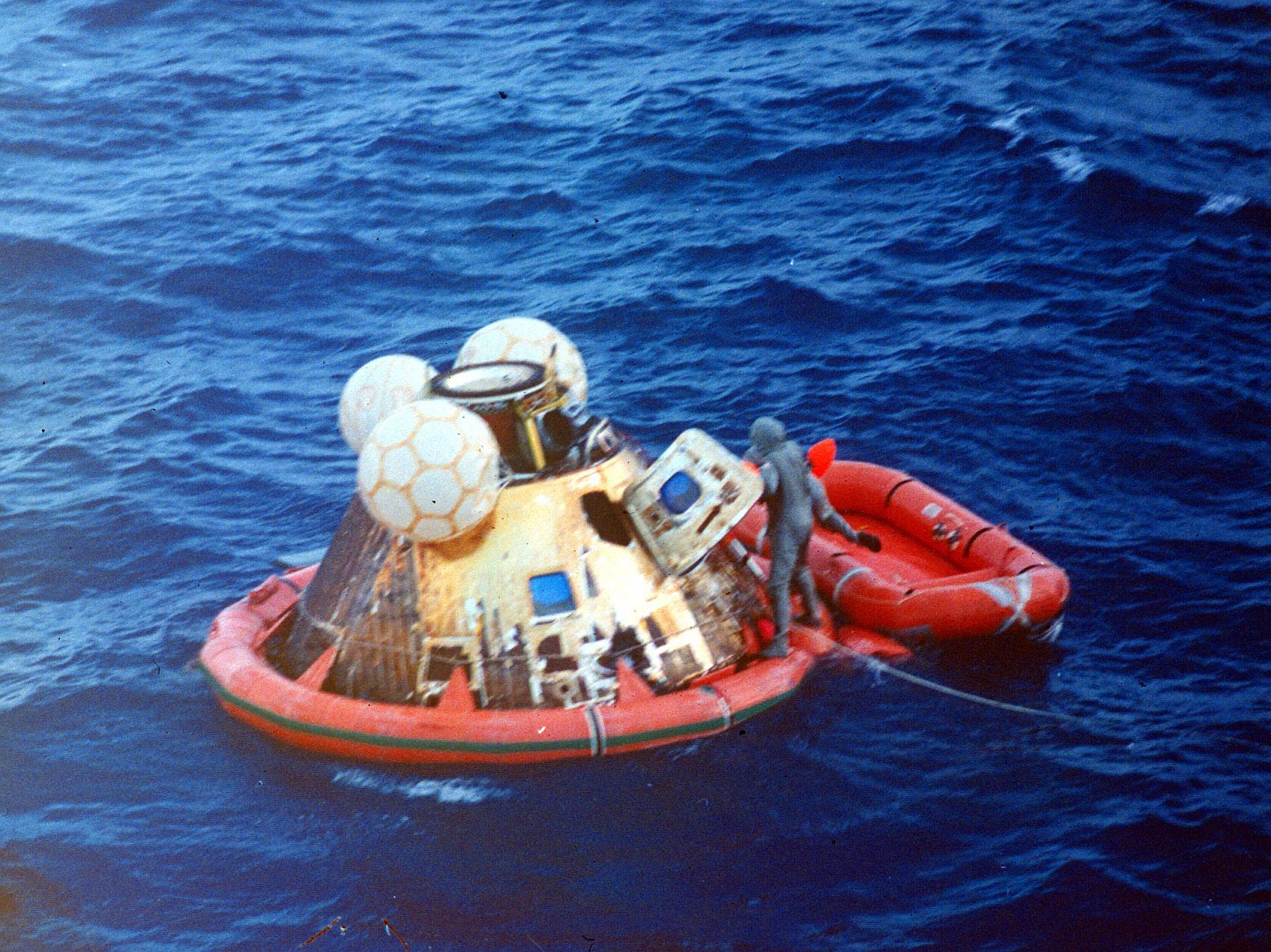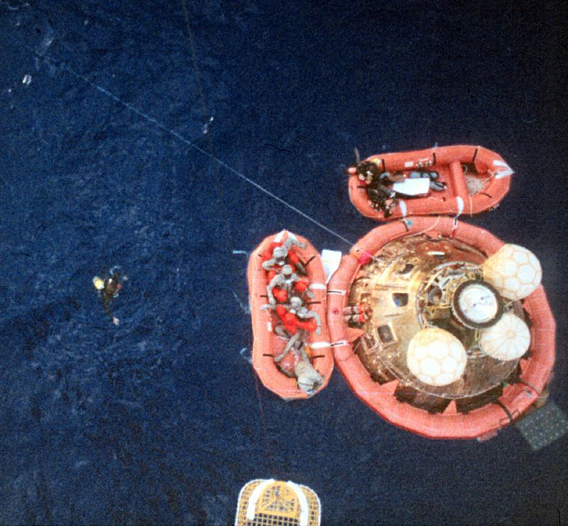 891k | During practice recovery, July 1969, Navy UDT swimmers (wearing orange and standing on flotation collar) finish attaching the flotation collar around the NASA boilerplate (a dummy capsule), with USS Hornet in background. US Navy photo by PH2 Milt Putnam, HS-4. |