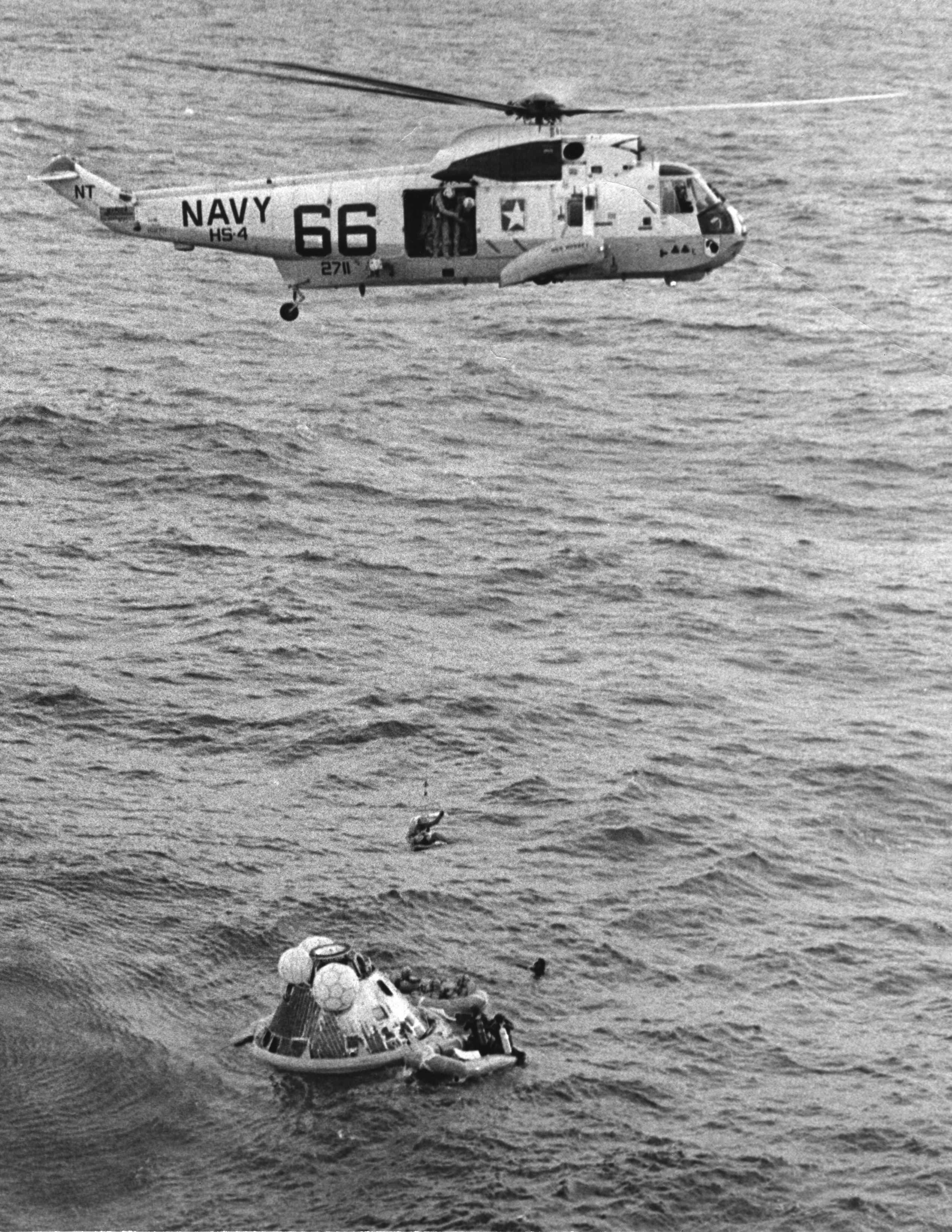 1.06M | An astronaut is now in the Billy Pugh rescue net and is being hoisted into the recovery helicopter, the world-famous "Helicopter 66." In comparison to photo NS-ha-570, note that the "66" is now shown in smaller digits and the Air Group designation (CVSG-59) has been added to the starboard sponson. At this point, only three CM decals, corresponding to Apollo 8, 10, and 11, can be seen under the cockpit. |