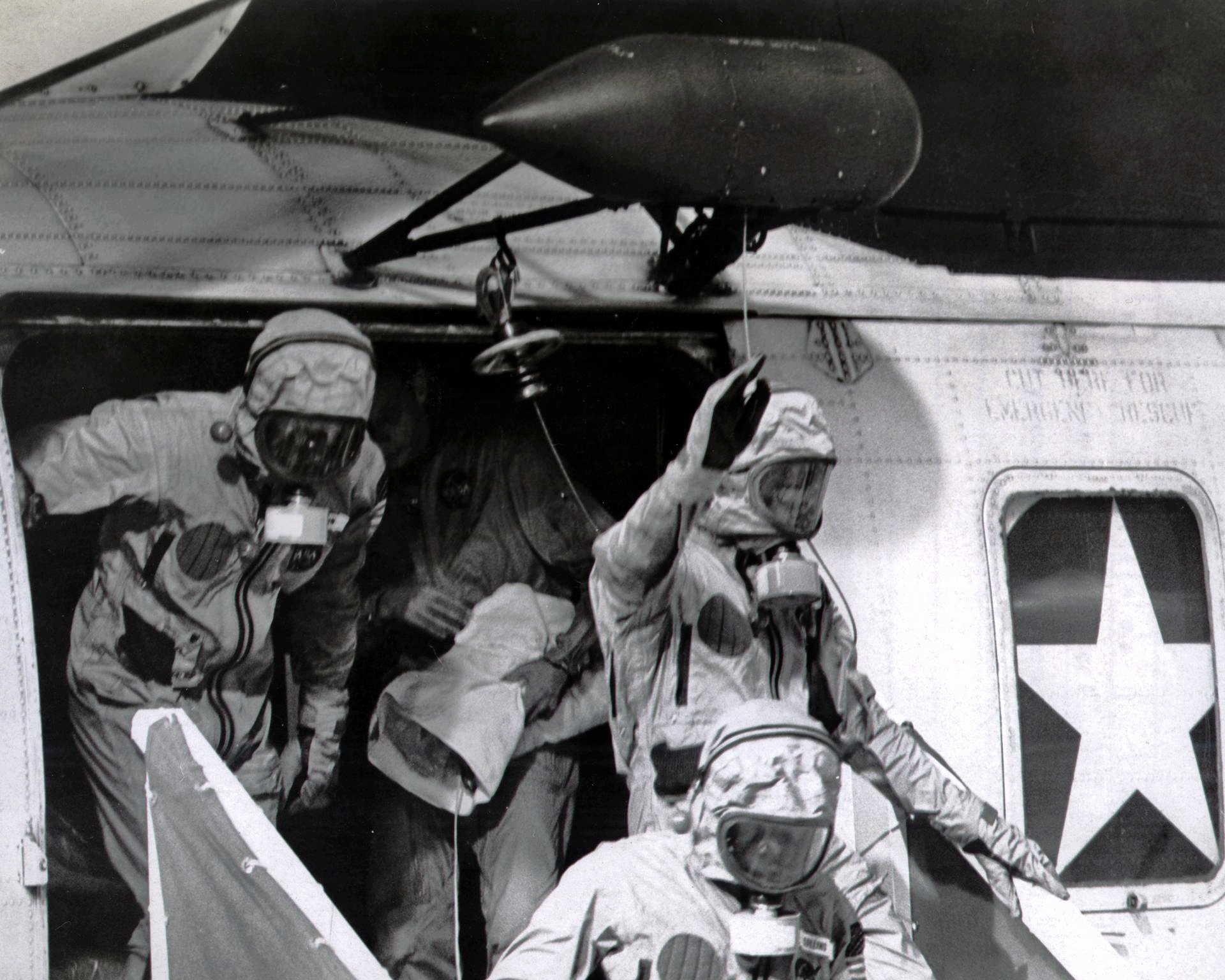 441k | The Apollo 12 astronauts, Charles F. Conrad, Jr., Richard F. Gordon, Jr., and Alan L. Bean, emerge from the SH-3D Sea King recovery helicopter of Helicopier anti-submarine Squadron Four (HS-4). They would go directly to the Mobile Quarantine Facility on the hangar deck of USS Hornet (CVS-12). Naval History and Heritage Command (HN&NC) photo USN 1142561 by PH1 J.W. Rogers. |