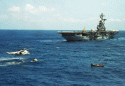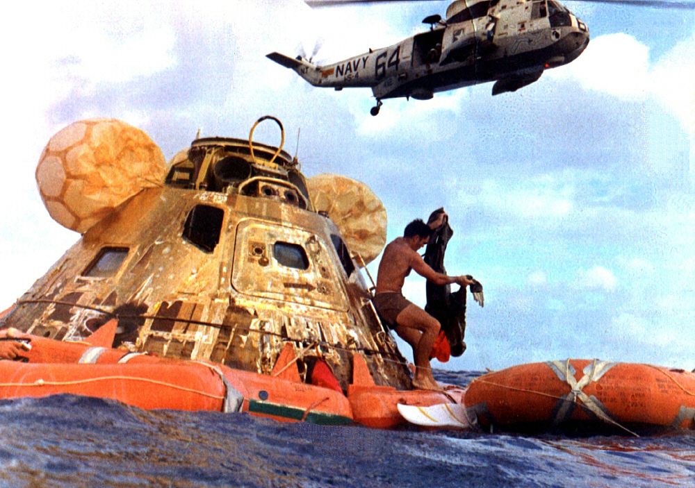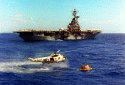1006k | During the 8-day Apollo 11 space flight, Hornet conducted 26 Simulated Recovery Exercises (SIMEX). A SIMEX always began with Hornet dropping the NASA boilerplate into the water and steaming a short distance away. Various helicopters, Underwater Demolition Teams (UDT), and crane operations were then practiced to ensure the real recovery would be flawless. In addition to using the ship's Boat and Aircraft (B&A) crane to recover the Command Module (CM), the bright yellow aircraft crash crane (Tilly) was also tested. "Practice" was considered a critical success factor for NASA since no one had ever walked on the moon before. US Navy photo by PH2 Milt Putnam. |
