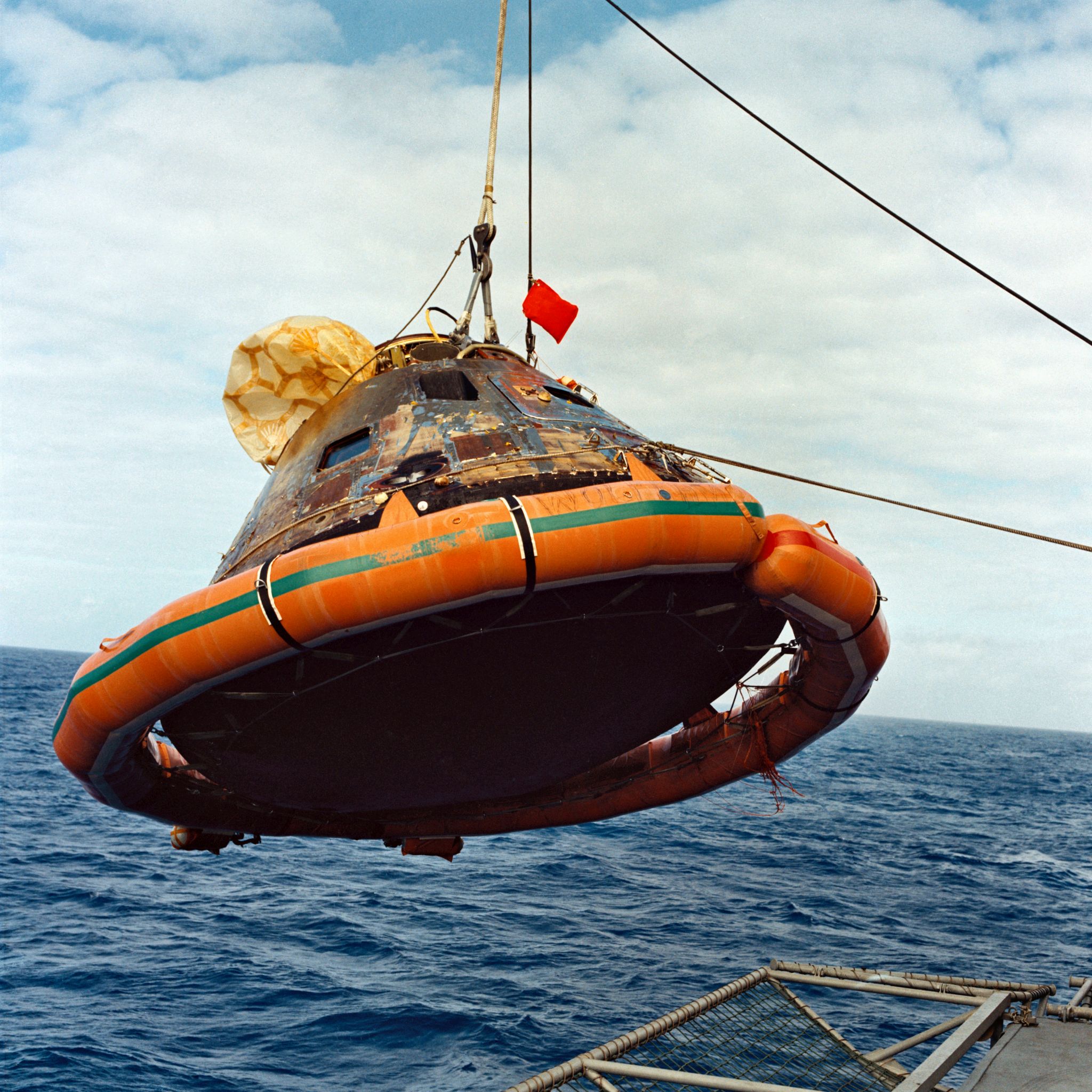 446k | The Apollo 12 Command Module, Yankee Clipper, is hoisted aboard USS Hornet (CVS-12). The spacecraft splashed down less than three miles from the aircraft carrier in the Pacific Ocean, southeast of the island of Samoa, Monday, 24 November 1969. Naval History & Heritage Command (NH&HC) photo K-80890. |