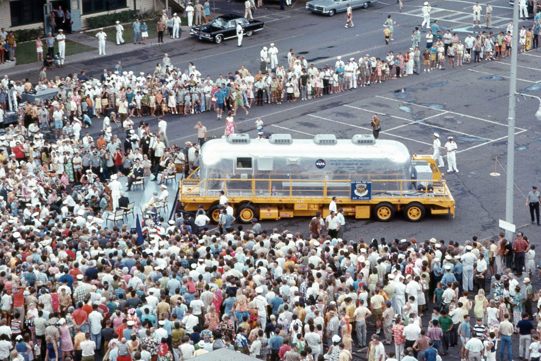 499k | From his perch above the Hornet flight deck, radio commentator Don Blair captured this moment after the MQF had been backed up to a stage next to Pier Bravo. The astronauts were welcomed to Hawaii by several dignitaries and hundreds of citizens who were allowed onto the Pearl Harbor Naval Base. CINCPAC, ADM John S. McCain, was speaking at this moment. Photo by Don Blair. |