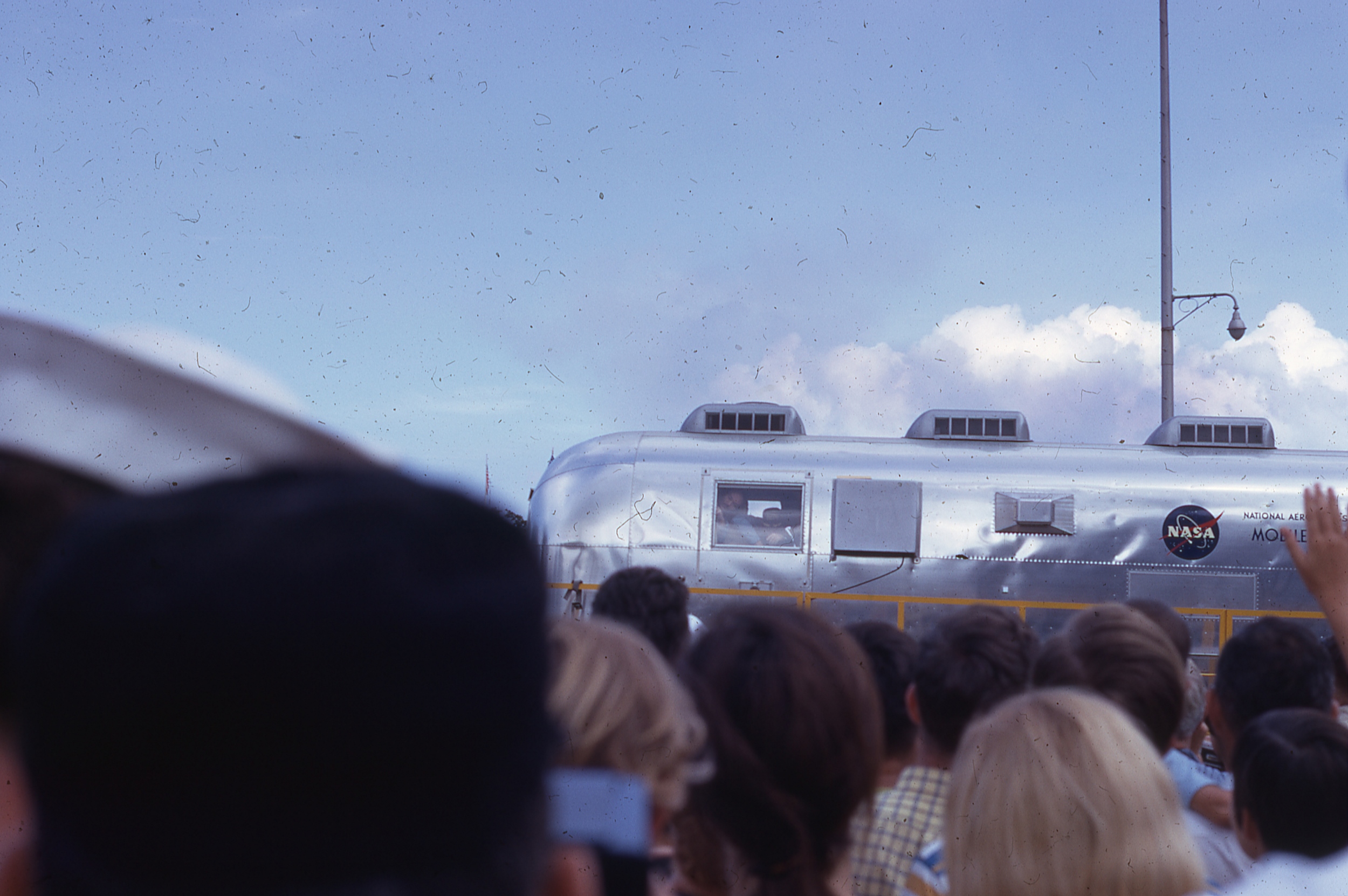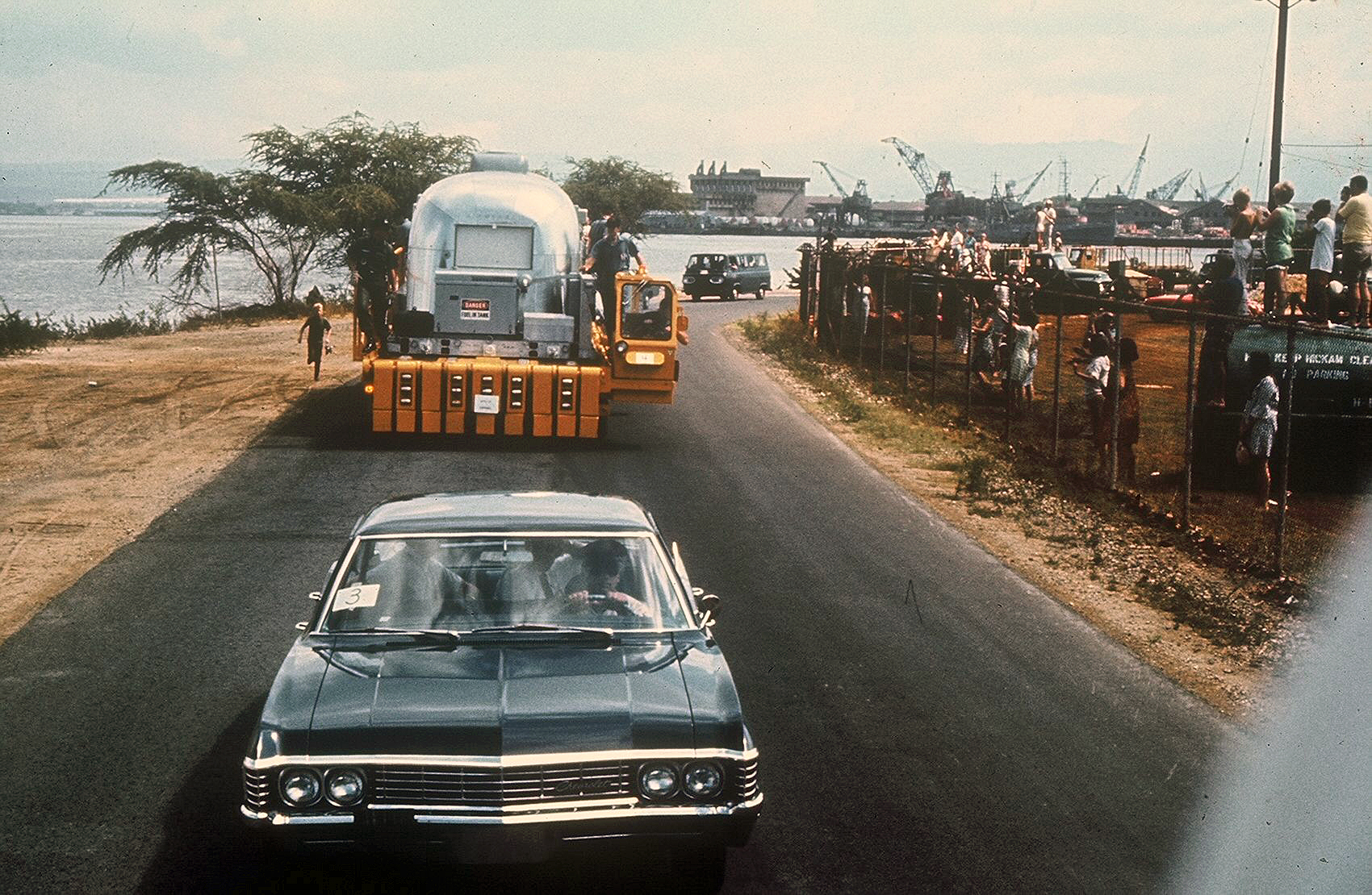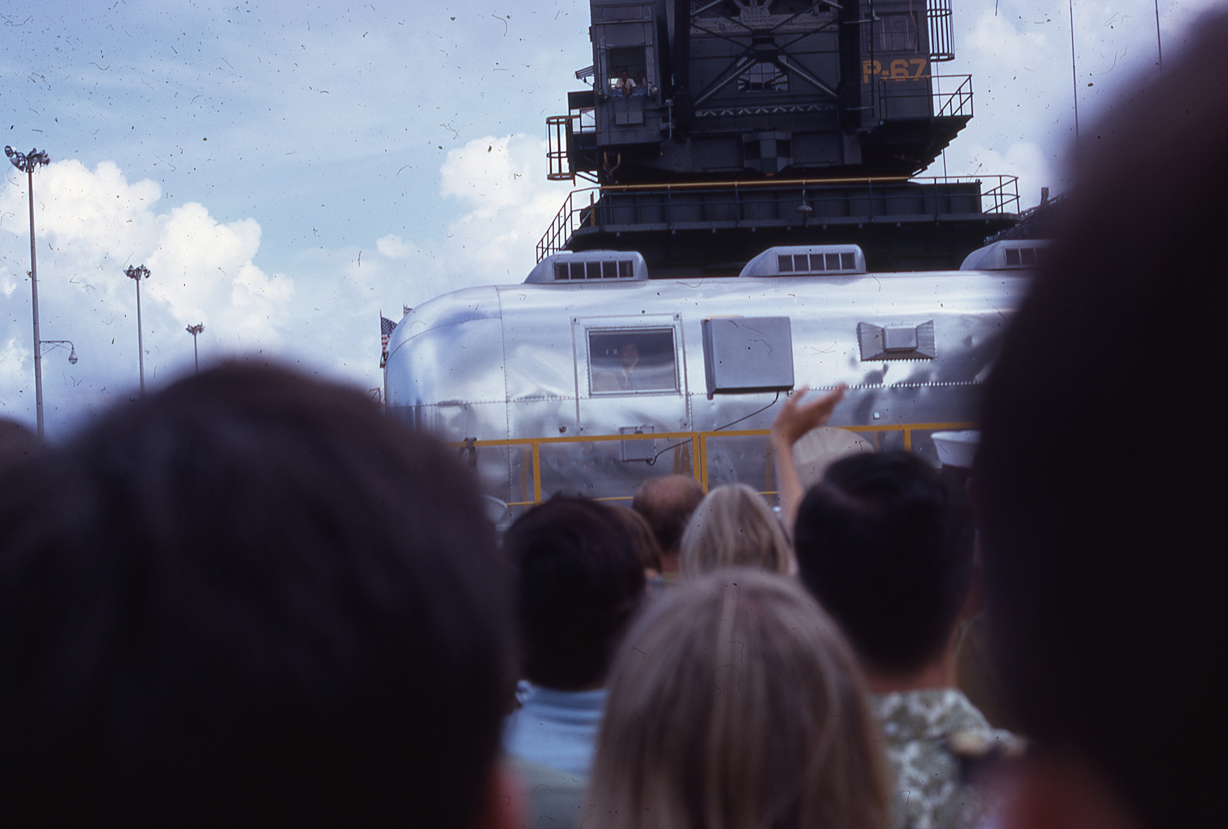 2.44M | The same scene, but from the point of view of the citizens who were allowed onto the Pearl Harbor Naval Base to welcome the astronauts. The Apollo 11 MQF was tugged to the edge of Hornet's starboard elevator and is now waiting for the giant shipyard crane to lower its lifting cables for attachment. Note the spreader bars just below the crane's hook—these were necessary to keep the thin-skinned aluminum MQF from collapsing inward when lifted. The yellow USAF cargo pallet loader awaits its new cargo, with the astronauts inside, as a TV camera on the ship's flight deck transmits live images around the world. Neil Armstrong (NS-ha-204) and Michael Collins (NS-ha-206) can be seen watching from the Mobile Quarantine Facility (MQF) window. (The MQF was a converted Airstream trailer, and was transferred to the Smithsonian Institution in 1974.) Mark Chambers, who took the pictures, lived in Hawaii from 1968 to 1972, while his father was stationed at Hickam AFB. |