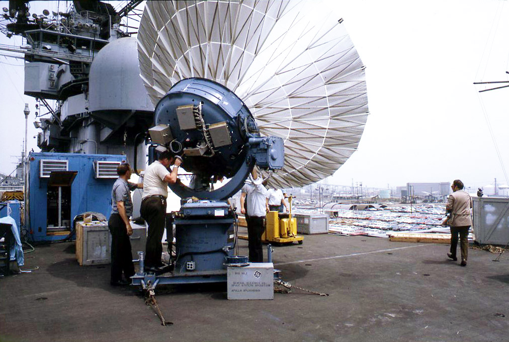 219k | At the Long Beach Naval Base, General Electric installed a one-way (broadcast) earth terminal to be used by ABC to broadcast video live via satellite back to the mainland USA, from where it was distributed worldwide. This photo shows the antenna before the white weather dome was placed over it. |