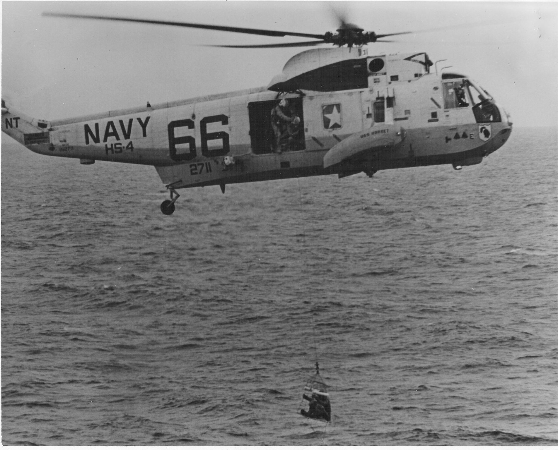 800k | A nice view of the starboard side of HS-4 "Black Nights" Sea King #66 (BuNo 152711) in flight. This photo was taken just after the recovery of Apollo 12 on Monday, 24 November 1969. Keen eyes will notice special modifications associated with the Apollo spacecraft recovery, such as the high-speed 70mm film camera mounted just aft of the cargo hatch (and aiming down) and the NASA SARAH (Search And Rescue And Homing) radio direction finding (RDF) antenna high up on the starboard landing gear strut, that provided the helicopter with the ability to home in on the spacecraft's radio beacon. By this time HS-4 side numbers had been changed to the 300 range, but 152711 had its new number painted out and replaced with the well known "66" on both sides and on the top of the fuselage, just behind the main rotor. In comparison to photo NS-ha-060, note that the "66" was now smaller and the Air Group designation, CVSG-59, had been added below "USS HORNET" on each sponson. A fourth black Apollo spacecraft decal was applied on the side of the cockpit before recovery of Apollo 12, then covered up, and uncovered as the helicopter landed with the astronauts aboard. Eventually this helicopter and HS-4 crews recovered the astronauts from five Apollo lunar flights—8, 10, 11, 12 and 13. USN photo by PHCS Robert L. Lawson. |